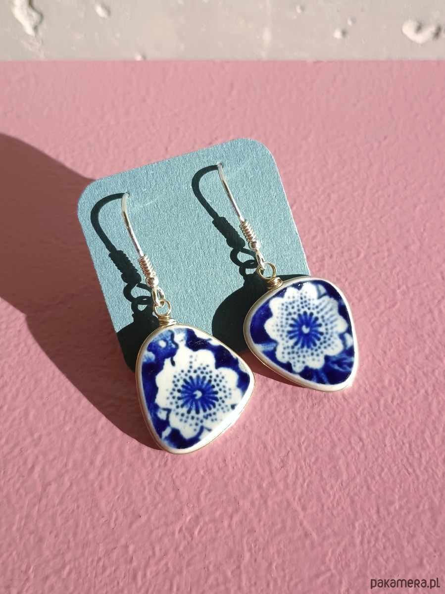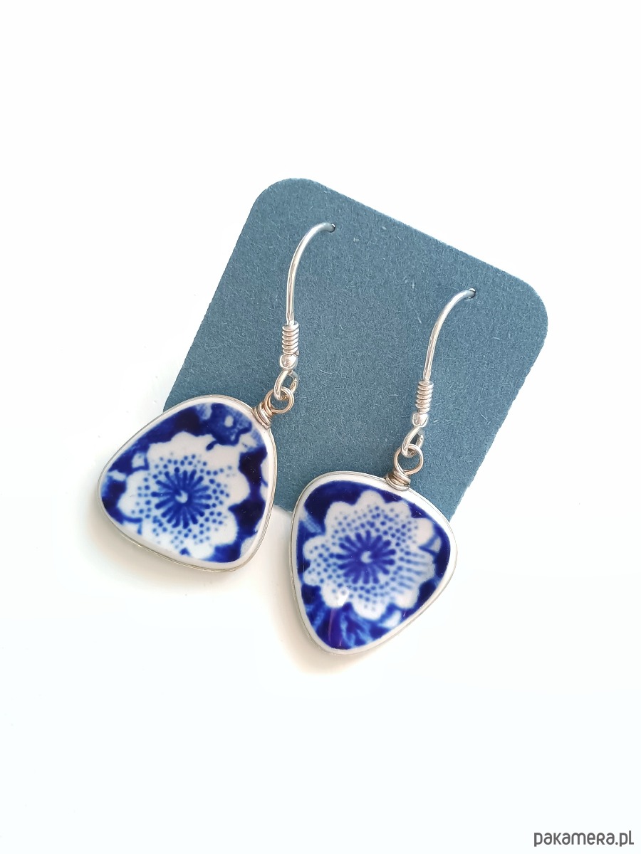 Oto wiszące kolczyki, które wykonałam z fragmentów stłuczonych talerzy z angielskiego fajansu w kobaltowe kwiaty. Kawałki stłuczki oszlifowałam w nieregularne opływowe kształty, oprawiłam w drucik i połączyłam ze srebrnymi biglami. Ceramikę zeszlifowałam również z grubości - jest cieńsza niż pierwotnie, dzięki czemu kolczyki nie są masywne. Brzegi i tył pokryłam lakierem, co sprawia, że nie brudzą się i nie chłoną wilgoci. Oprawa oraz bigle (zapięcia) wykonane są ze srebra próby 925 - wyrób jest antyalergiczny. Wymiary elementów ceramicznych: 18 x 19 mm. Waga jednego kolczyka: 1,9 g. Unikat - każdy z moich wyrobów występuje w jednym egzemplarzu. Upcykling - nie reprodukuję wykorzystywanych wzorów, niczego nie domalowuję - wykorzystuję wyłącznie oryginalne naczynia i motywy, które się na nich znajdują. Tym samym, stłuczce z odzysku nadaję nowe życie.