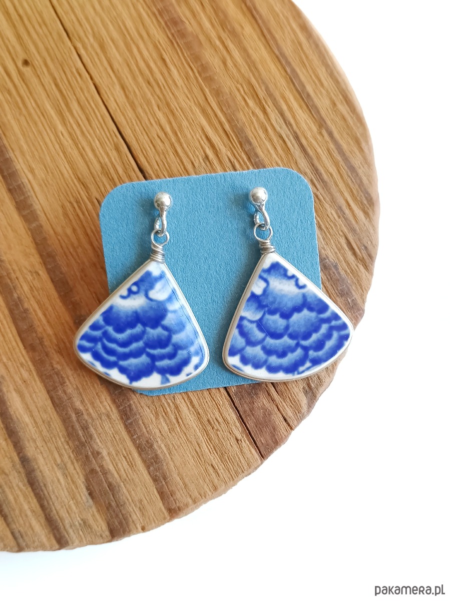 Duże wiszące kolczyki, które wykonałam z fragmentów stłuczonego talerza Villeroy & Boch w kobaltowe motywy roślinne. Kawałki stłuczki oszlifowałam w trójkątne kształty, oprawiłam w drucik i połączyłam ze srebrnymi sztyftami. Porcelanę zeszlifowałam również z grubości - jest cieńsza niż pierwotnie, dzięki czemu kolczyki nie są masywne. Brzegi i tył pokryłam lakierem, co sprawia, że nie brudzą się i nie chłoną wilgoci. Sztyfty, baranki oraz oprawa wykonane są ze srebra próby 925 - wyrób jest antyalergiczny. Wymiary elementów ceramicznych: 21 x 21 mm. Waga jednego kolczyka: 1,7 g. Unikat - każdy z moich wyrobów występuje w jednym egzemplarzu. Upcykling - nie reprodukuję wykorzystywanych wzorów, niczego nie domalowuję - wykorzystuję wyłącznie oryginalne naczynia i motywy, które się na nich znajdują. Tym samym, stłuczce z odzysku nadaję nowe życie.