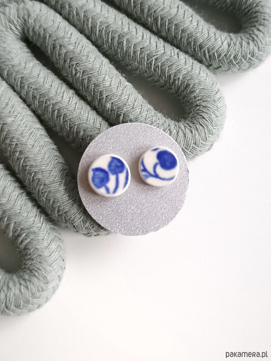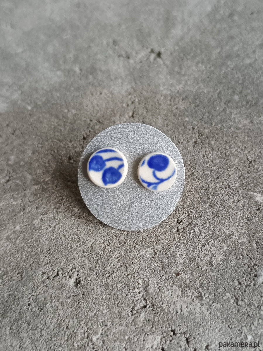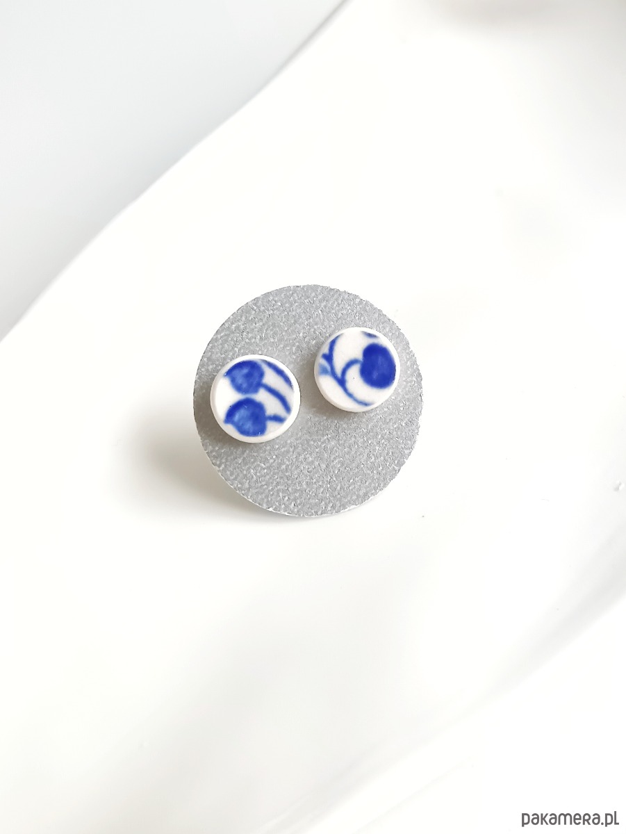 Nieduże okrągłe kolczyki, które wykonałam z fragmentów stłuczonego talerza fajansowego Villeroy & Boch w kobaltowe wzory. Kawałki stłuczki oszlifowałam i połączyłam ze srebrnymi sztyftami. Ceramikę zeszlifowałam również z grubości - jest cieńsza niż pierwotnie, dzięki czemu kolczyki nie są masywne. Brzegi i tył pokryłam lakierem, co sprawia, że nie brudzą się i nie chłoną wilgoci. Sztyfty oraz baranki (zapięcia) wykonane są ze srebra próby 925 - wyrób jest antyalergiczny. Średnica elementów ceramicznych: 8 mm. Unikat - każdy z moich wyrobów występuje w jednym egzemplarzu. Upcykling - nie reprodukuję wykorzystywanych wzorów, niczego nie domalowuję - wykorzystuję wyłącznie oryginalne naczynia i motywy, które się na nich znajdują. Tym samym, stłuczce z odzysku nadaję nowe życie.