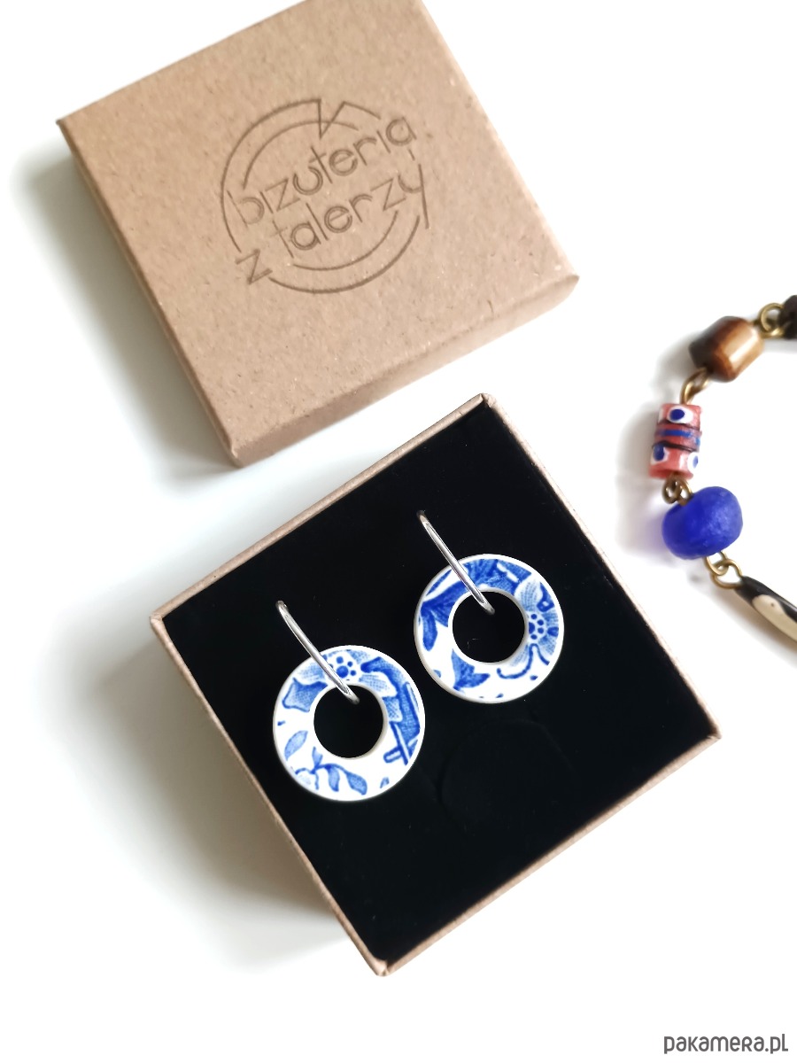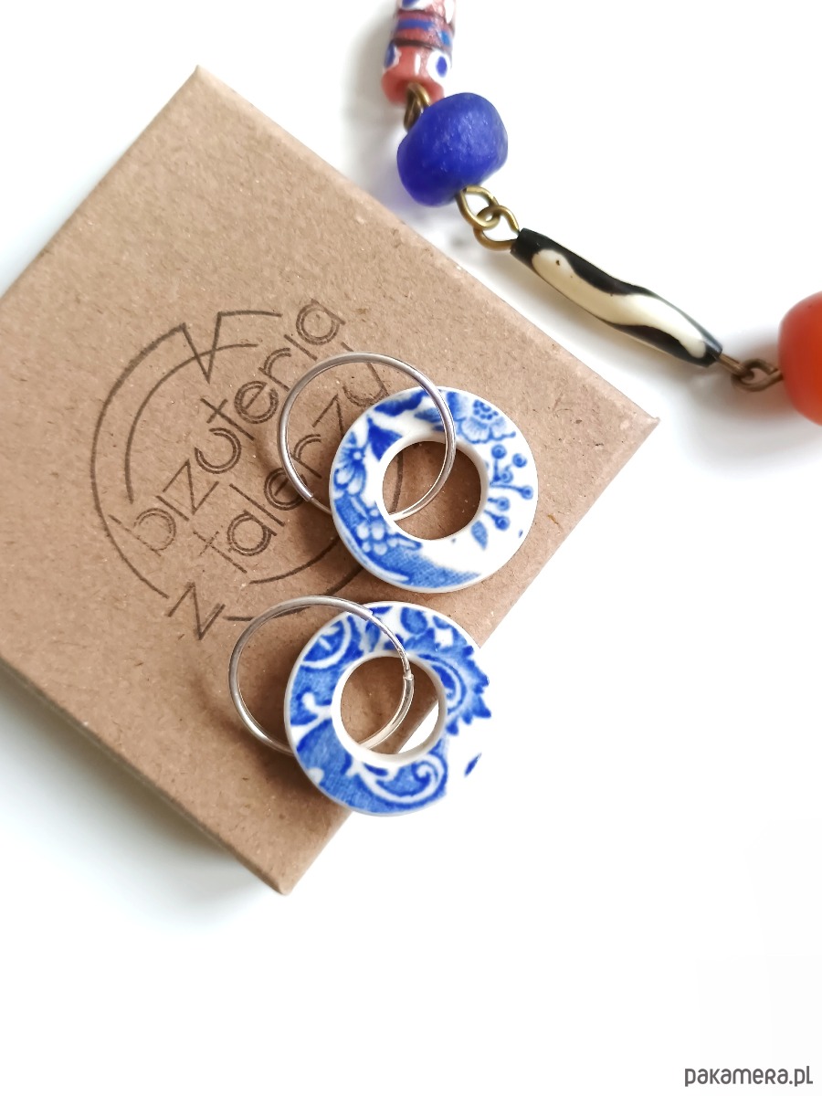 Oto wiszące kolczyki, które wykonałam z fragmentów stłuczonej patery fajansowej Villeroy & Boch w kobaltowe wzory kwiatowe, które znajdowały się zarówno wewnątrz jak i na zewnątrz naczynia. Kawałki ceramiki oszlifowałam w okrągłe kształty i połączyłam ze srebrnymi zapięciami. Brzegi pokryłam lakierem, co sprawia, że nie brudzą się i nie chłoną wilgoci. Zapięcie, czyli koła o średnicy 19 mm wykonane są ze srebra próby 925 - wyrób jest antyalergiczny. Średnica elementów ceramicznych: 22 mm. Waga jednego kolczyka: 2,8 g. Unikat - każdy z moich wyrobów występuje w jednym egzemplarzu. Upcykling - nie reprodukuję wykorzystywanych wzorów, niczego nie domalowuję - wykorzystuję wyłącznie oryginalne naczynia i motywy, które się na nich znajdują. Tym samym, stłuczce z odzysku nadaję nowe życie.