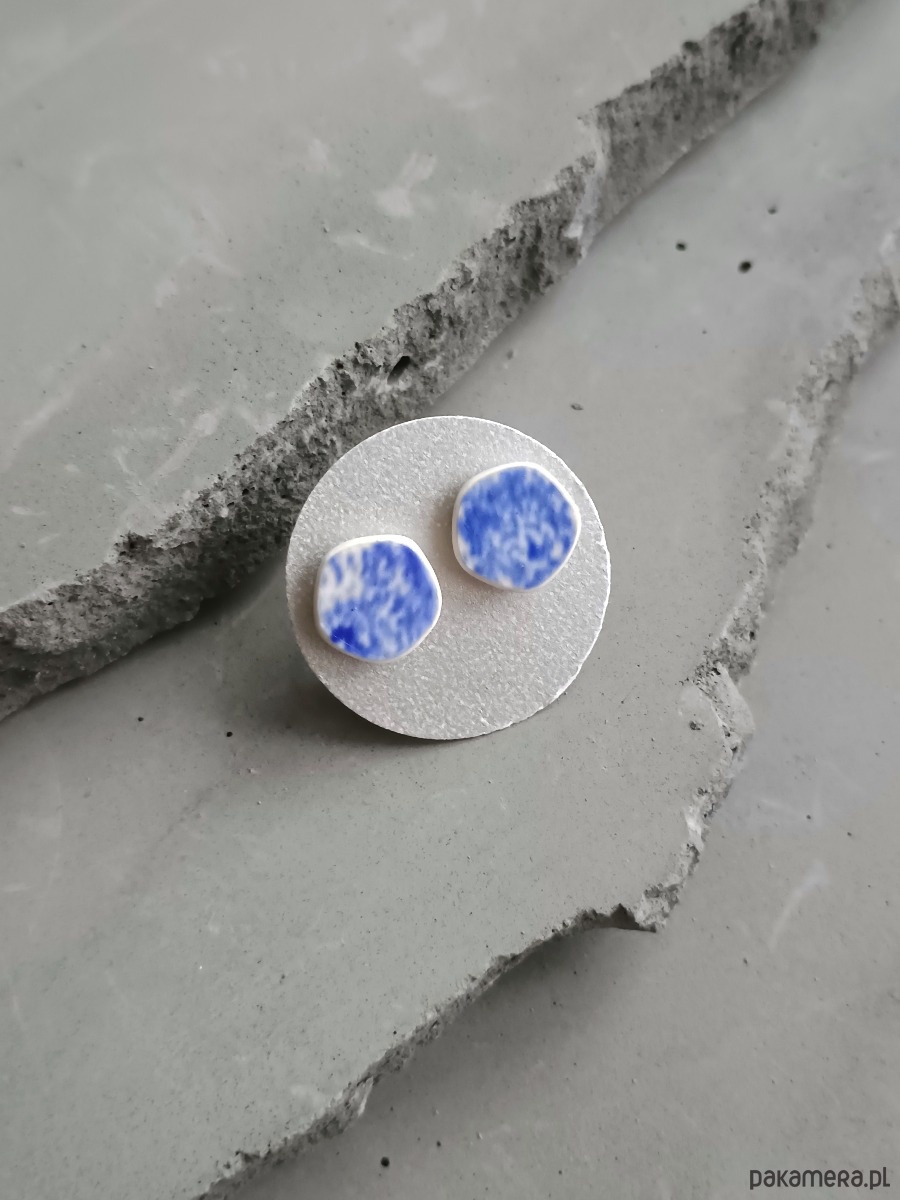 Nieduże kolczyki, które wykonałam z fragmentów stłuczonego talerza fajansowego Villeroy & Boch w kobaltowe wzory. Kawałki stłuczki oszlifowałam w opływowe pięciokątne kształty i połączyłam ze srebrnymi sztyftami. Ceramikę zeszlifowałam również z grubości - jest cieńsza niż pierwotnie, dzięki czemu kolczyki nie są masywne. Brzegi i tył pokryłam lakierem, co sprawia, że nie brudzą się i nie chłoną wilgoci. Sztyfty oraz baranki (zapięcia) wykonane są ze srebra próby 925 - wyrób jest antyalergiczny. Wymiary elementów ceramicznych: 9 x 9 mm. Unikat - każdy z moich wyrobów występuje w jednym egzemplarzu. Upcykling - nie reprodukuję wykorzystywanych wzorów, niczego nie domalowuję - wykorzystuję wyłącznie oryginalne naczynia i motywy, które się na nich znajdują. Tym samym, stłuczce z odzysku nadaję nowe życie.