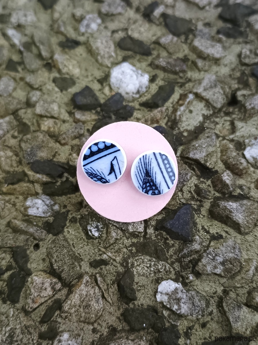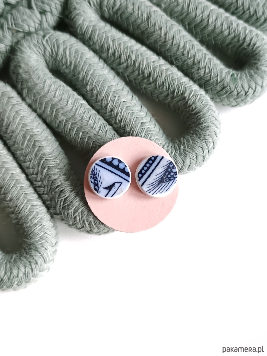 Nieduże okrągłe kolczyki, które wykonałam z fragmentów stłuczonego fajansowego talerza w kobaltowe wzory. Kawałki stłuczki oszlifowałam i połączyłam ze srebrnymi sztyftami. Ceramikę zeszlifowałam również z grubości - jest cieńsza niż pierwotnie, dzięki czemu kolczyki nie są masywne. Brzegi pokryłam lakierem, co sprawia, że nie brudzą się i nie chłoną wilgoci. Sztyfty oraz baranki (zapięcia) wykonane są ze srebra próby 925 - wyrób jest antyalergiczny. Średnica elementów ceramicznych: 10 mm. Unikat - każdy z moich wyrobów występuje w jednym egzemplarzu. Upcykling - nie reprodukuję wykorzystywanych wzorów, niczego nie domalowuję - wykorzystuję wyłącznie oryginalne naczynia i motywy, które się na nich znajdują. Tym samym, stłuczce z odzysku nadaję nowe życie.