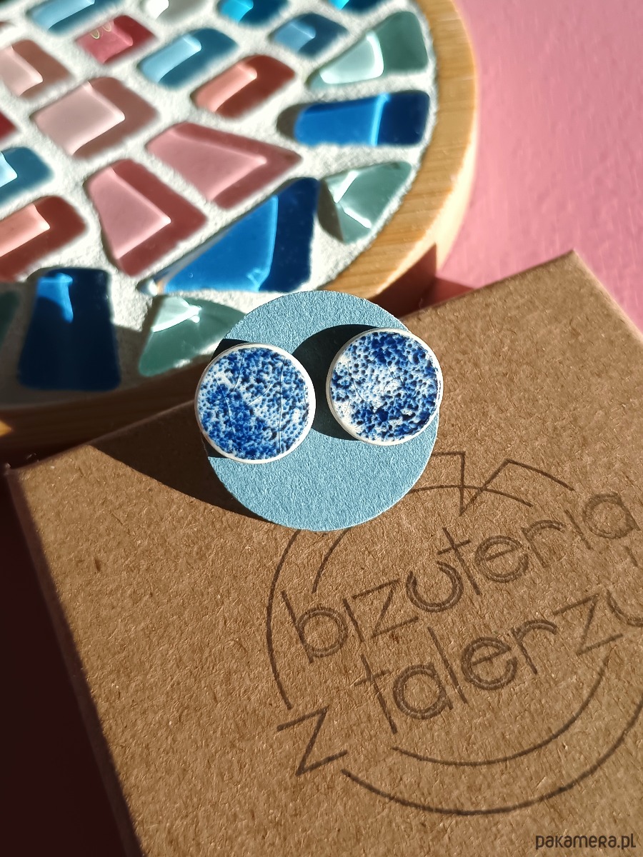 Nieduże kolczyki, które wykonałam z fragmentów stłuczonego talerza z fajansu angielskiego w kobaltowe wzory. Kawałki stłuczki oszlifowałam w okrągłe kształty i połączyłam ze srebrnymi sztyftami. Ceramikę zeszlifowałam również z grubości - jest cieńsza niż pierwotnie, dzięki czemu kolczyki nie są masywne. Brzegi i tył pokryłam lakierem, co sprawia, że nie brudzą się i nie chłoną wilgoci. Sztyfty oraz baranki (zapięcia) wykonane są ze srebra próby 925 - wyrób jest antyalergiczny. Średnica elementów ceramicznych: 11 mm. Unikat - każdy z moich wyrobów występuje w jednym egzemplarzu. Upcykling - nie reprodukuję wykorzystywanych wzorów, niczego nie domalowuję - wykorzystuję wyłącznie oryginalne naczynia i motywy, które się na nich znajdują. Tym samym, stłuczce z odzysku nadaję nowe życie.