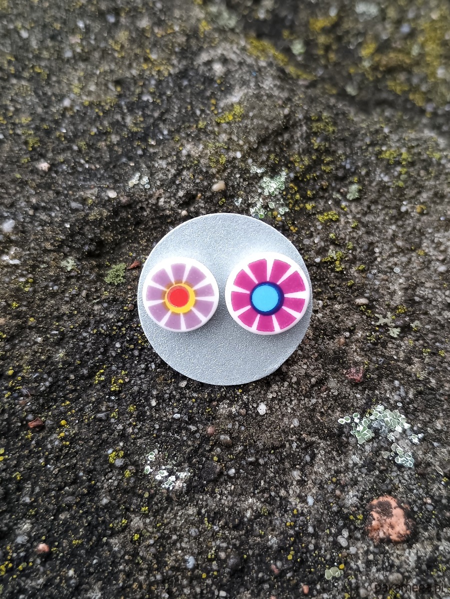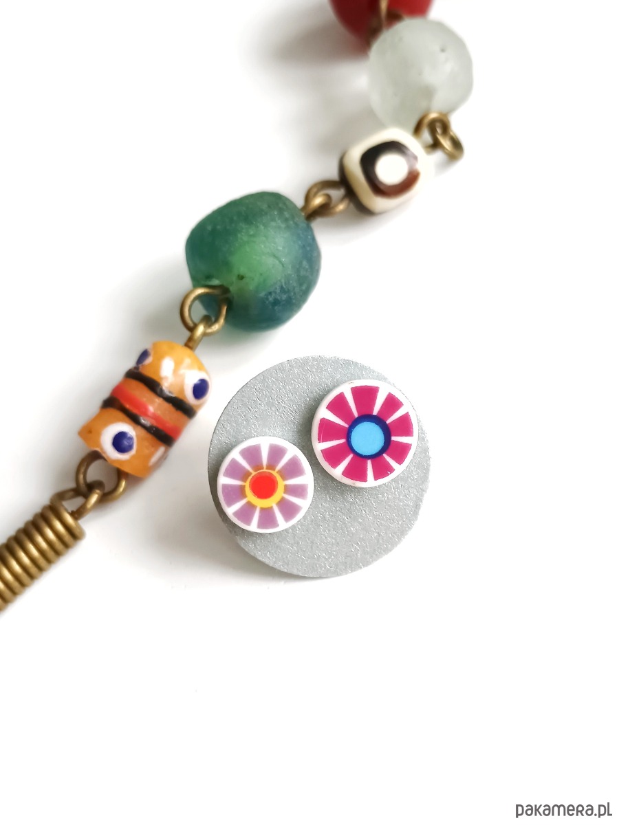 Nieduże asymetryczne okrągłe kolczyki, które wykonałam z fragmentów stłuczonego talerza w łowickie wzory. Kawałki stłuczki oszlifowałam i połączyłam ze srebrnymi sztyftami. Ceramikę zeszlifowałam również z grubości - jest cieńsza niż pierwotnie, dzięki czemu kolczyki nie są masywne. Brzegi pokryłam lakierem, co sprawia, że nie brudzą się i nie chłoną wilgoci. Sztyfty oraz baranki (zapięcia) wykonane są ze srebra próby 925 - wyrób jest antyalergiczny. Średnica elementów ceramicznych: 9 i 10 mm. Unikat - każdy z moich wyrobów występuje w jednym egzemplarzu. Upcykling - nie reprodukuję wykorzystywanych wzorów, niczego nie domalowuję - wykorzystuję wyłącznie oryginalne naczynia i motywy, które się na nich znajdują. Tym samym, stłuczce z odzysku nadaję nowe życie.