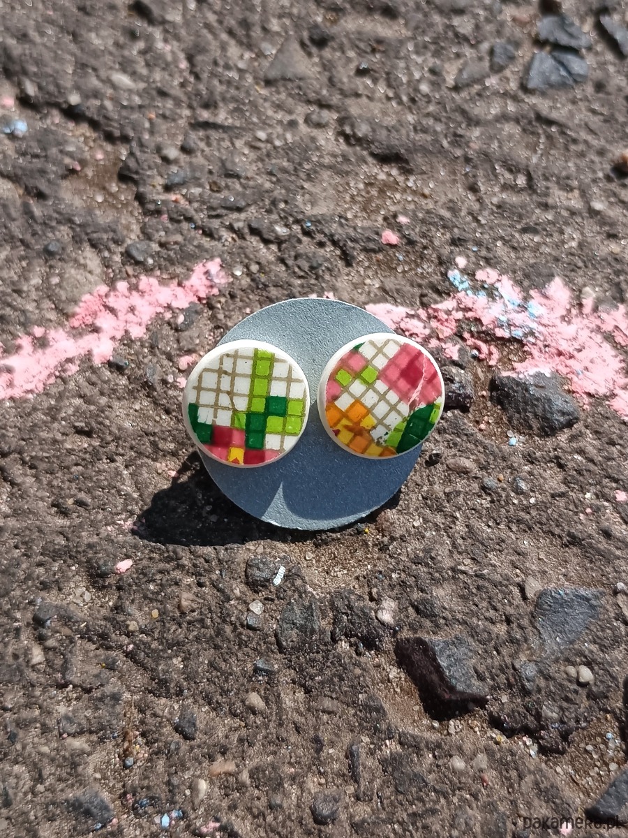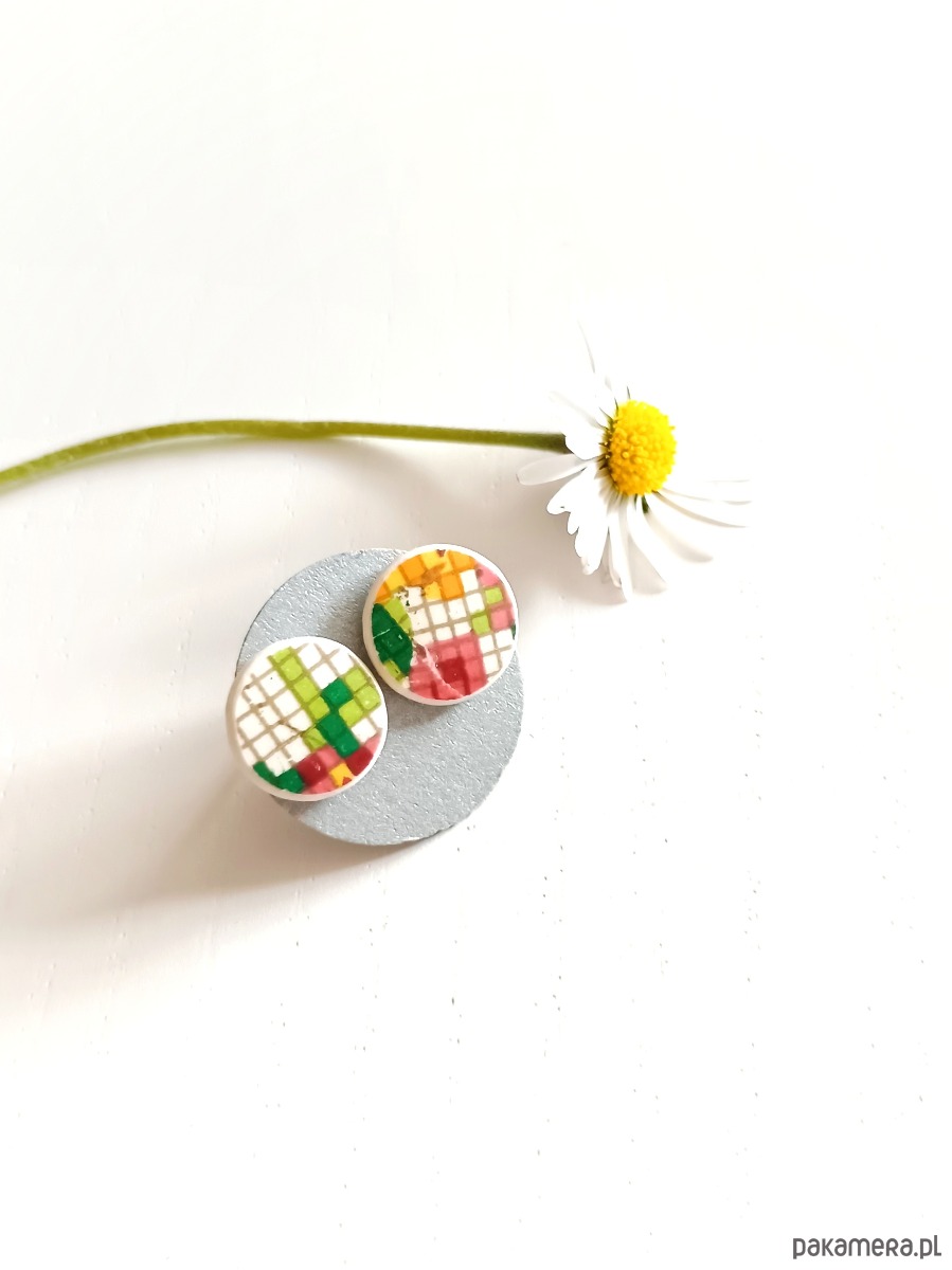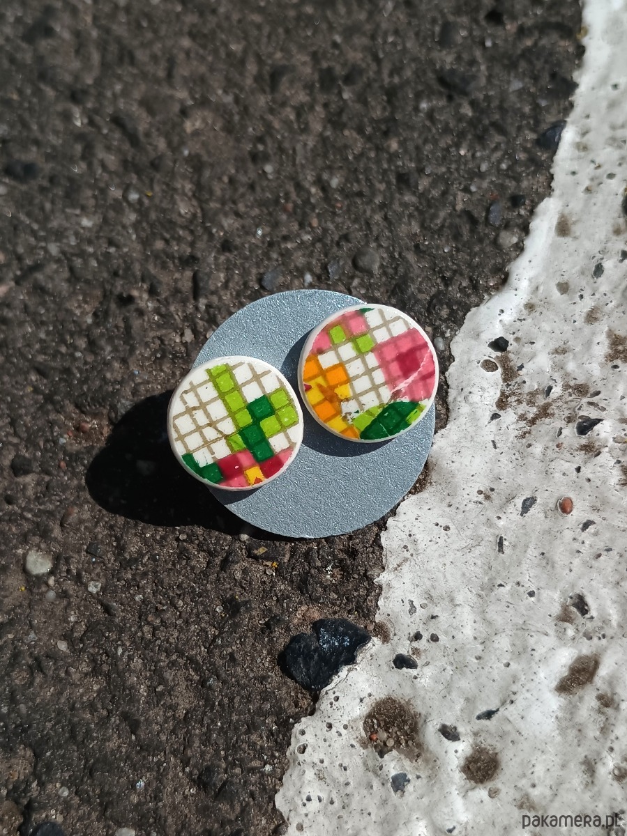 Okrągłe kolczyki, które wykonałam z fragmentów stłuczonej filiżanki z fajansu angielskiego w kolorowe wzory. Kawałki stłuczki oszlifowałam i połączyłam ze srebrnymi sztyftami. Ceramikę zeszlifowałam również z grubości - jest cieńsza niż pierwotnie, dzięki czemu kolczyki nie są masywne. Brzegi i tył pokryłam lakierem, co sprawia, że nie brudzą się i nie chłoną wilgoci. Sztyfty oraz baranki (zapięcia) wykonane są ze srebra próby 925 - wyrób jest antyalergiczny. Średnica elementów ceramicznych: 12 mm. Unikat - każdy z moich wyrobów występuje w jednym egzemplarzu. Upcykling - nie reprodukuję wykorzystywanych wzorów, niczego nie domalowuję - wykorzystuję wyłącznie oryginalne naczynia i motywy, które się na nich znajdują. Tym samym, stłuczce z odzysku nadaję nowe życie.
