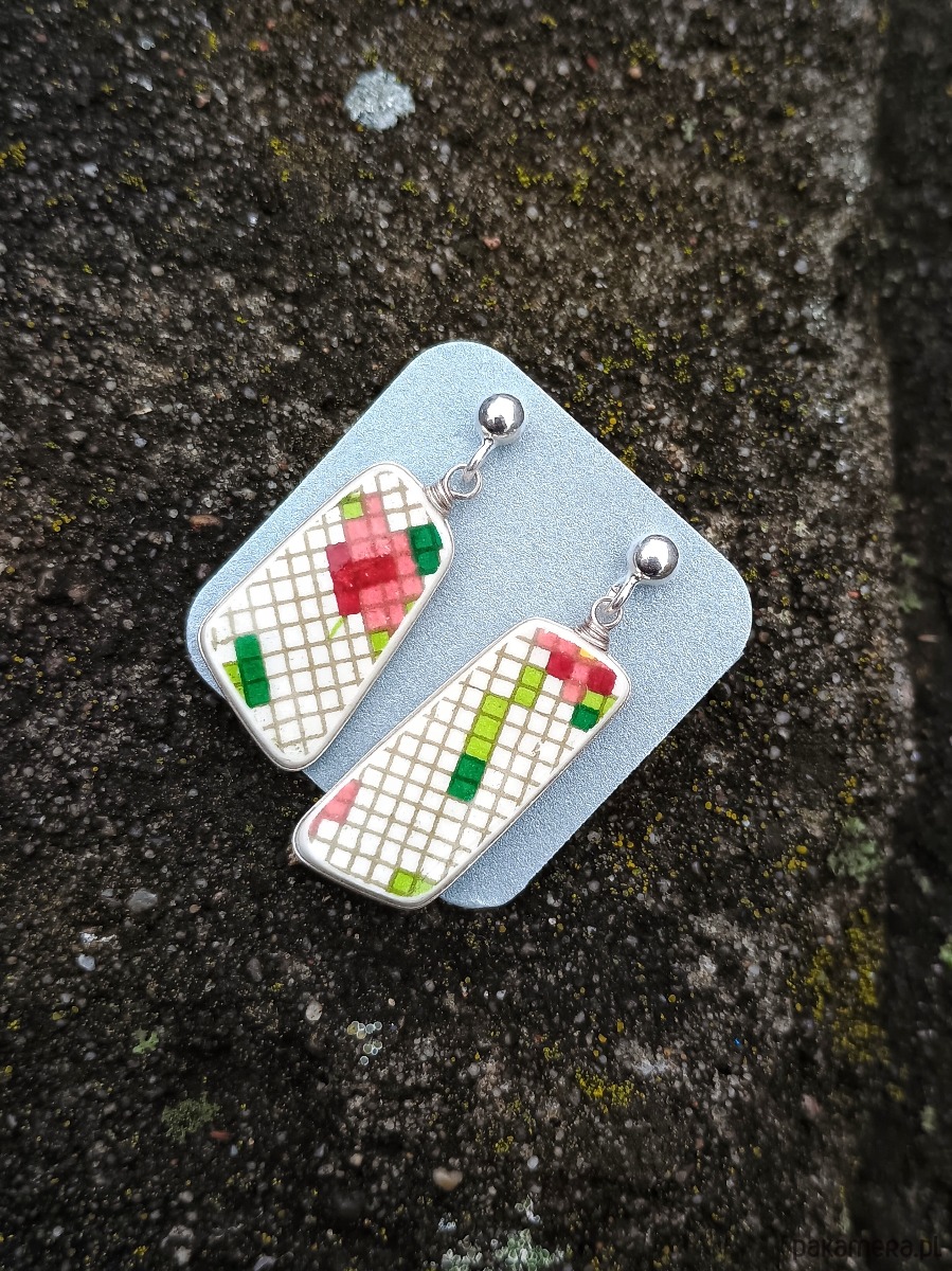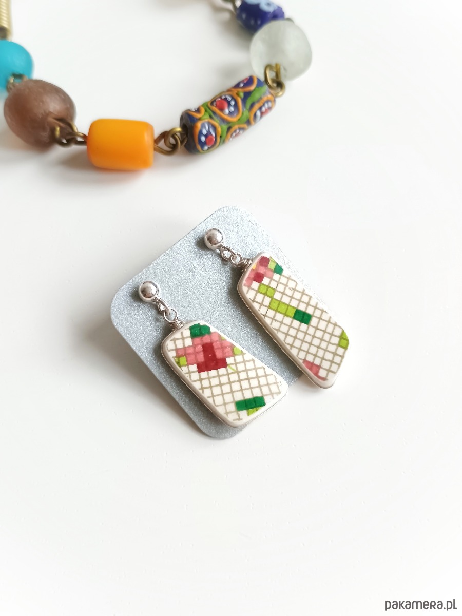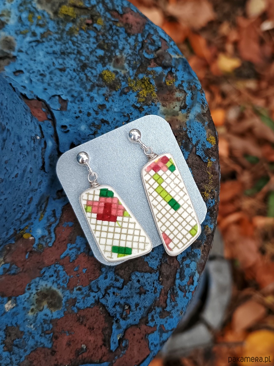 Oto kolczyki, które wykonałam z fragmentów stłuczonej fiiżanki z fajansu angielskiego w kolorowe wzory. Kawałki stłuczki oszlifowałam w asymetryczne kształty, oprawiłam w drucik i połączyłam ze srebrnymi sztyftami. Brzegi pokryłam lakierem, co sprawia, że nie brudzą się i nie chłoną wilgoci. Oprawa oraz sztyfty wykonane są ze srebra próby 925 - wyrób jest antyalergiczny. Wymiary elementów ceramicznych 11 x 24 i 13 x 20 mm. Waga jednego kolczyka: 2,1 g. Unikat - każdy z moich wyrobów występuje w jednym egzemplarzu. Upcykling - nie reprodukuję wykorzystywanych wzorów, niczego nie domalowuję - wykorzystuję wyłącznie oryginalne naczynia i motywy, które się na nich znajdują. Tym samym, stłuczce z odzysku nadaję nowe życie.