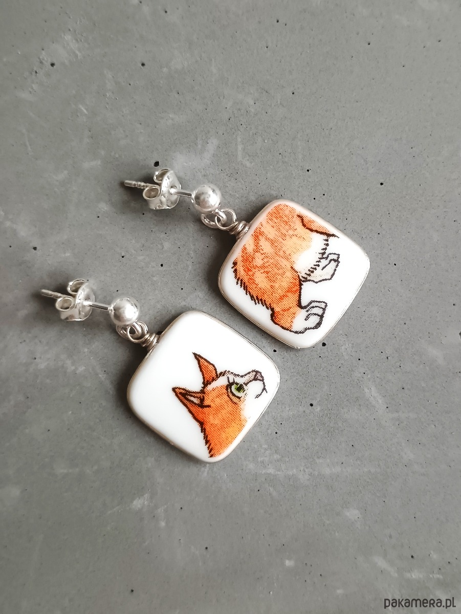 Wiszące kolczyki, które wykonałam z fragmentów stłuczonego kubka w koty. Kawałki stłuczki oszlifowałam w kwadratowe kształty, oprawiłam w drucik i połączyłam ze srebrnymi sztyftami. Porcelanę zeszlifowałam również z grubości - jest cieńsza niż pierwotnie, dzięki czemu kolczyki nie są masywne. Brzegi i tył pokryłam lakierem, co sprawia, że nie brudzą się i nie chłoną wilgoci. Sztyfty, baranki oraz oprawa wykonane są ze srebra próby 925 - wyrób jest antyalergiczny. Wymiary elementów ceramicznych: 16 x 16 mm. Waga jednego kolczyka: 1,9 g. Unikat - każdy z moich wyrobów występuje w jednym egzemplarzu. Upcykling - nie reprodukuję wykorzystywanych wzorów, niczego nie domalowuję - wykorzystuję wyłącznie oryginalne naczynia i motywy, które się na nich znajdują. Tym samym, stłuczce z odzysku nadaję nowe życie.