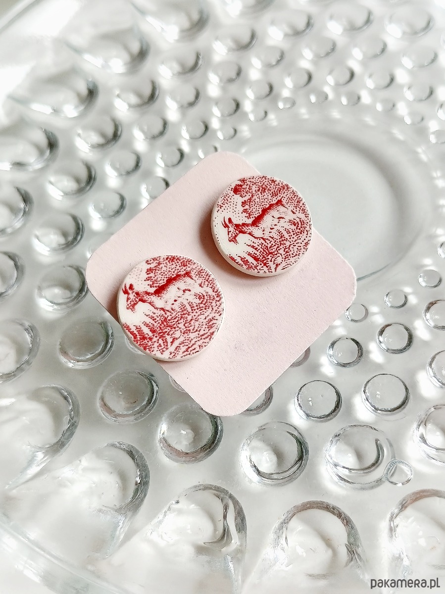 Duże okrągłe kolczyki, które wykonałam z fragmentów stłuczonego talerza Villeroy & Boch Burgenland w czerwone wzory. Na wybranych fragmentach widoczne są sympatyczne kózki. Kawałki stłuczki oszlifowałam w okrągłe kształty i połączyłam ze srebrnymi sztyftami. Ceramikę zeszlifowałam również z grubości - jest cieńsza niż pierwotnie, dzięki czemu kolczyki nie są masywne. Brzegi pokryłam lakierem, co sprawia, że nie brudzą się i nie chłoną wilgoci. Sztyfty oraz baranki (zapięcia) wykonane są ze srebra próby 925 - wyrób jest antyalergiczny. Średnica elementów ceramicznych: 16 mm. Unikat - każdy z moich wyrobów występuje w jednym egzemplarzu. Upcykling - nie reprodukuję wykorzystywanych wzorów, niczego nie domalowuję - wykorzystuję wyłącznie oryginalne naczynia i motywy, które się na nich znajdują. Tym samym, stłuczce z odzysku nadaję nowe życie.