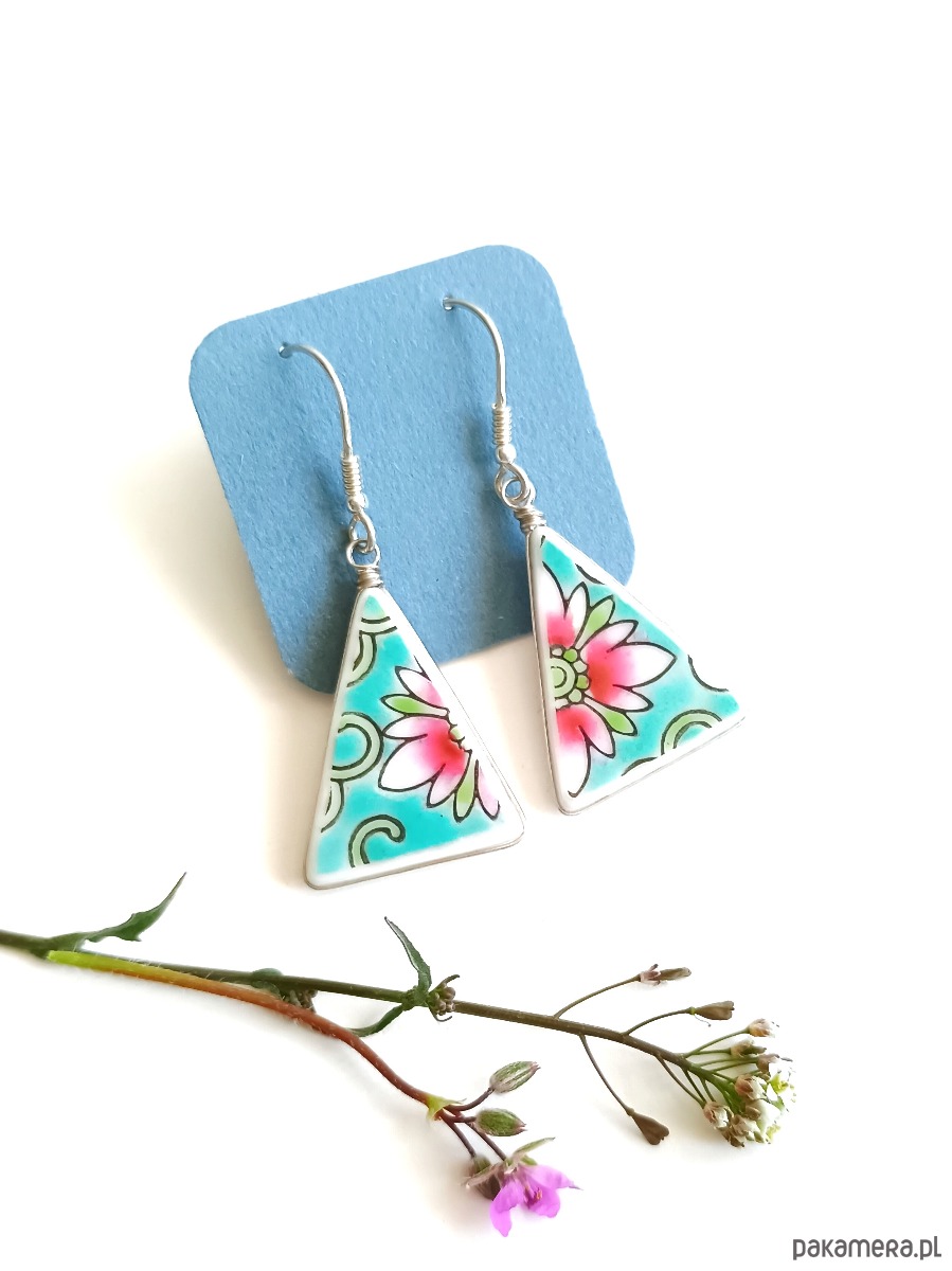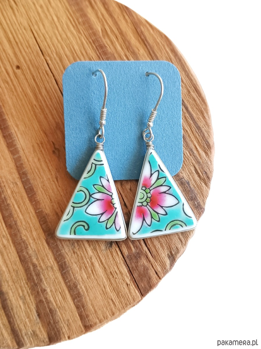 Oto wiszące kolczyki, które wykonałam z fragmentów stłuczonego talerza. Po jednej stronie znajdują się wzory kwiatowe, po drugiej - sygnatura. Kawałki stłuczki oszlifowałam w kształt trójkątów, oprawiłam w drucik i połączyłam ze srebrnymi sztyftami. Brzegi pokryłam lakierem, co sprawia, że nie brudzą się i nie chłoną wilgoci. Oprawa, sztyfty oraz baranki (zapięcia) wykonane są ze srebra próby 925 - wyrób jest antyalergiczny. Wymiary elementów ceramicznych: 19 x 24 mm. Waga jednego kolczyka: 2,9 g. Unikat - każdy z moich wyrobów występuje w jednym egzemplarzu. Upcykling - nie reprodukuję wykorzystywanych wzorów, niczego nie domalowuję - wykorzystuję wyłącznie oryginalne naczynia i motywy, które się na nich znajdują. Tym samym, stłuczce z odzysku nadaję nowe życie.