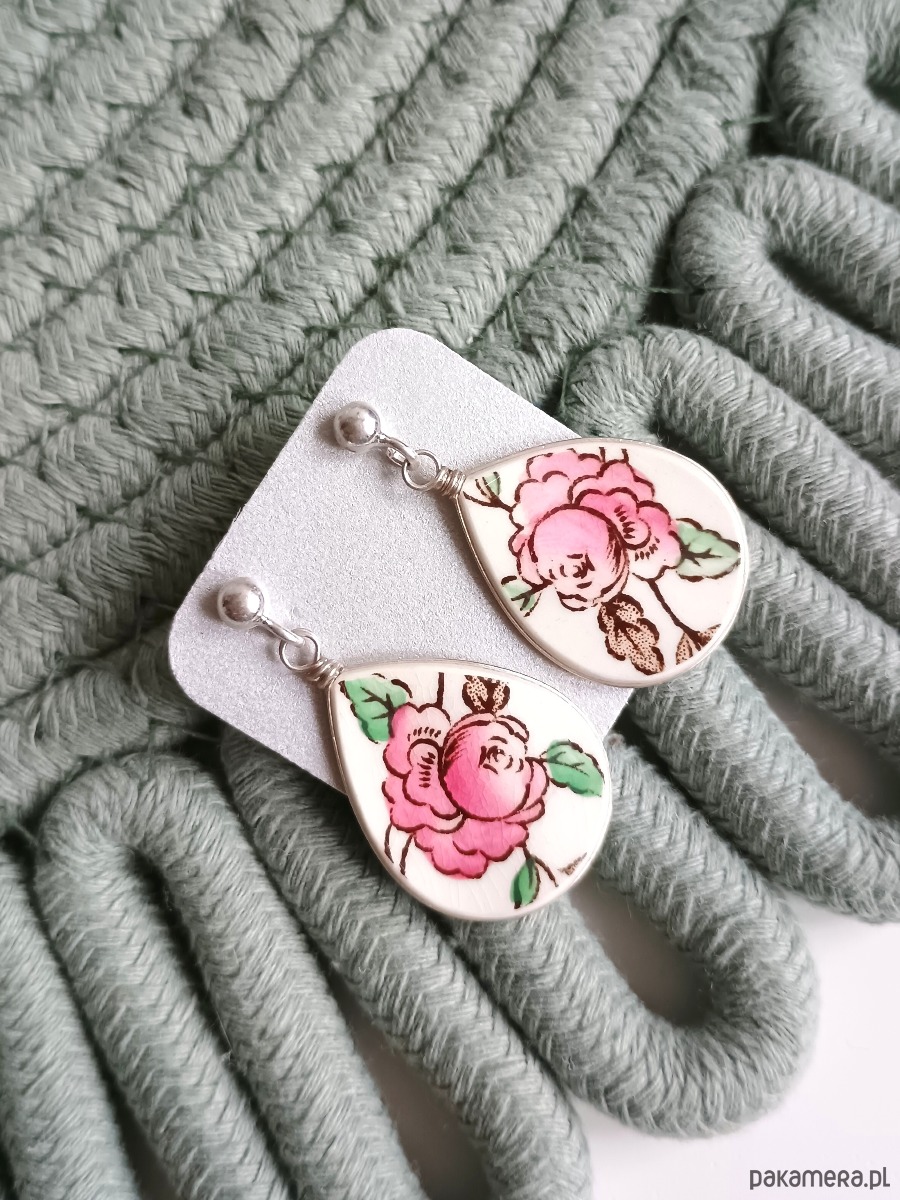 Wiszące kolczyki, które wykonałam z fragmentów stłuczonego talerza z fajansu angielskiego Copeland Spode we wzory roślinne i owady. Kawałki stłuczki oszlifowałam w kształt łezek, oprawiłam w drucik i połączyłam ze srebrnymi sztyftami. Ceramikę zeszlifowałam również z grubości, dzięki czemu kolczyki nie są ciężkie. Brzegi i tył pokryłam lakierem, co sprawia, że nie brudzą się i nie chłoną wilgoci. Oprawa, sztyfty oraz baranki (zapięcia) wykonane są ze srebra próby 925 - wyrób jest antyalergiczny. Wymiary elementów ceramicznych: 19 x 24 mm. Waga jednego kolczyka: 1,9 g. Unikat - każdy z moich wyrobów występuje w jednym egzemplarzu. Upcykling - nie reprodukuję wykorzystywanych wzorów, niczego nie domalowuję - wykorzystuję wyłącznie oryginalne naczynia i motywy, które się na nich znajdują. Tym samym, stłuczce z odzysku nadaję nowe życie.