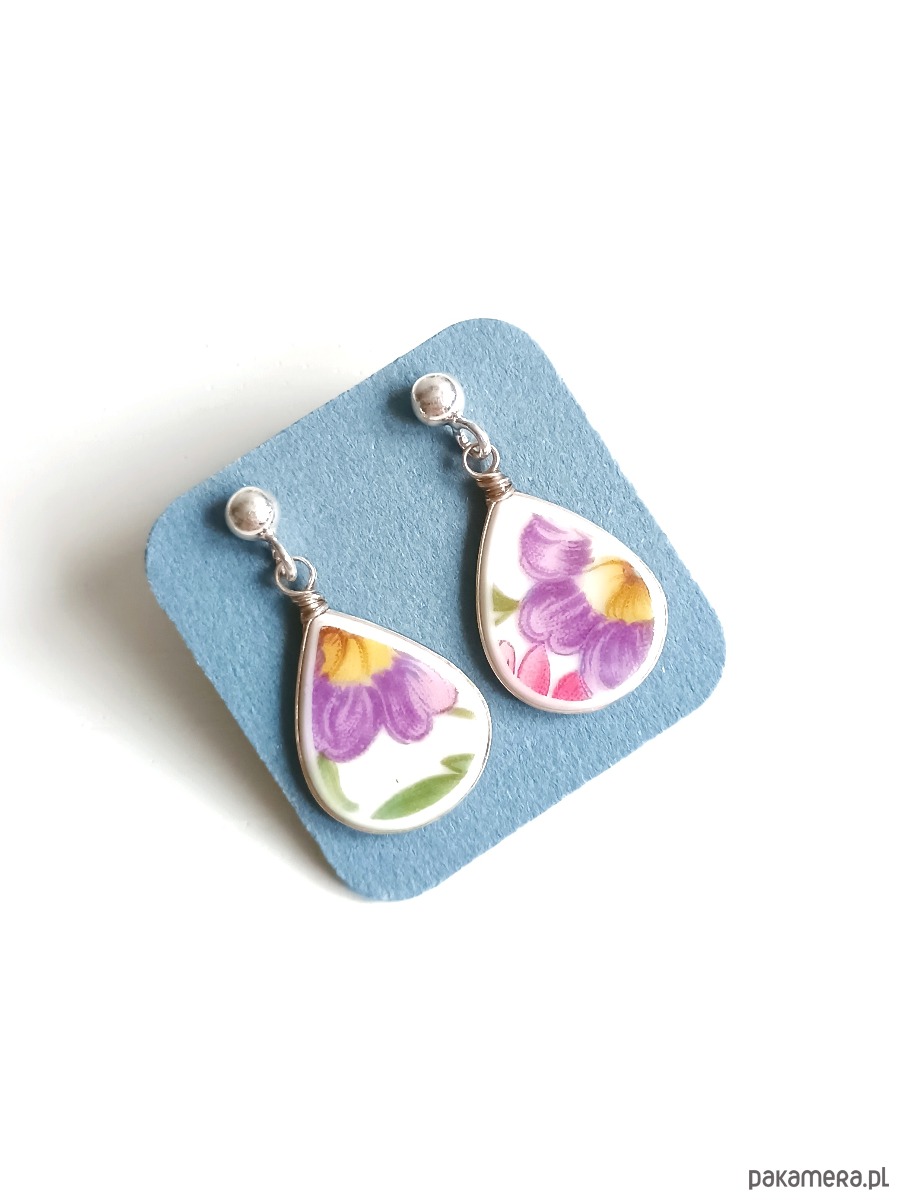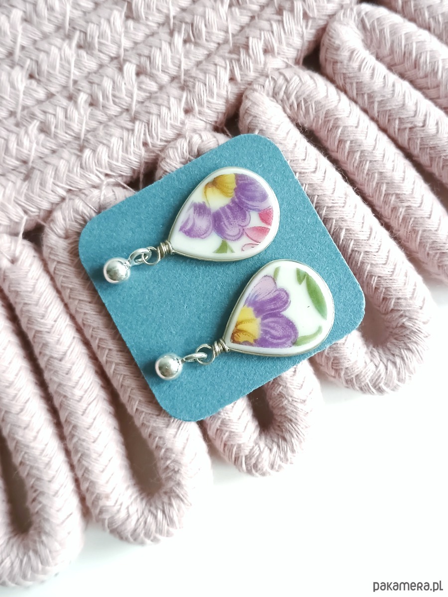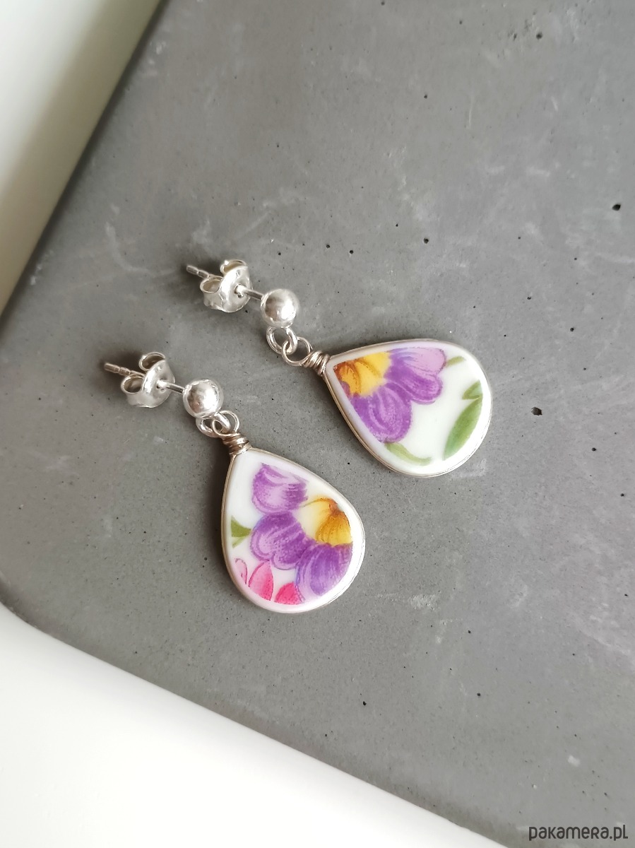 Nieduże wiszące kolczyki, które wykonałam z fragmentów starej porcelany - stłuczonego talerza w motywy roślinne. Kawałki stłuczki oszlifowałam w kształt łezek, oprawiłam w drucik i połączyłam ze srebrnymi sztyftami. Porcelanę zeszlifowałam również z grubości - jest cieńsza niż pierwotnie, dzięki czemu kolczyki nie są masywne. Brzegi i tył pokryłam lakierem, co sprawia, że nie brudzą się i nie chłoną wilgoci. Sztyfty, baranki oraz oprawa wykonane są ze srebra próby 925 - wyrób jest antyalergiczny. Wymiary elementów ceramicznych: 13 x 17 mm. Waga jednego kolczyka: 1,2 g. Unikat - każdy z moich wyrobów występuje w jednym egzemplarzu. Upcykling - nie reprodukuję wykorzystywanych wzorów, niczego nie domalowuję - wykorzystuję wyłącznie oryginalne naczynia i motywy, które się na nich znajdują. Tym samym, stłuczce z odzysku nadaję nowe życie.