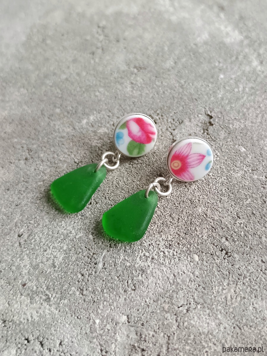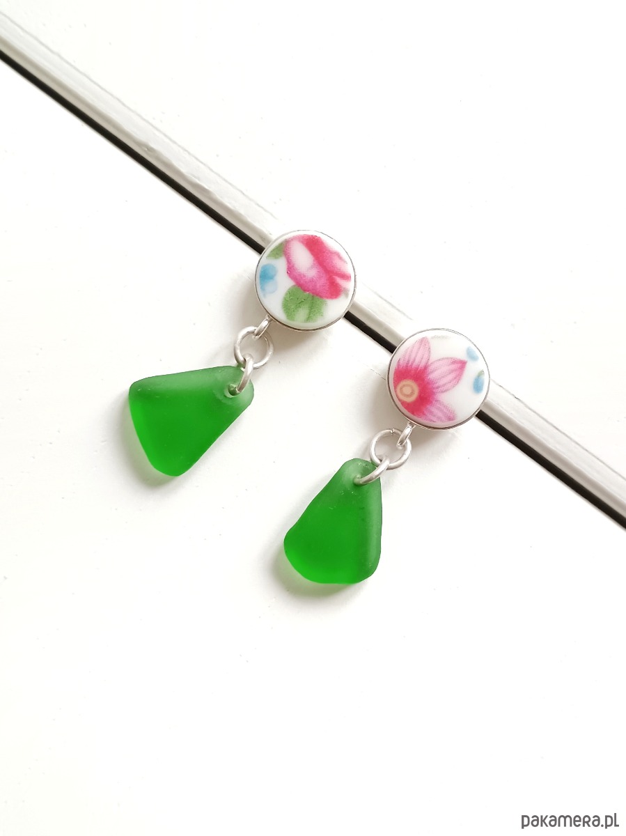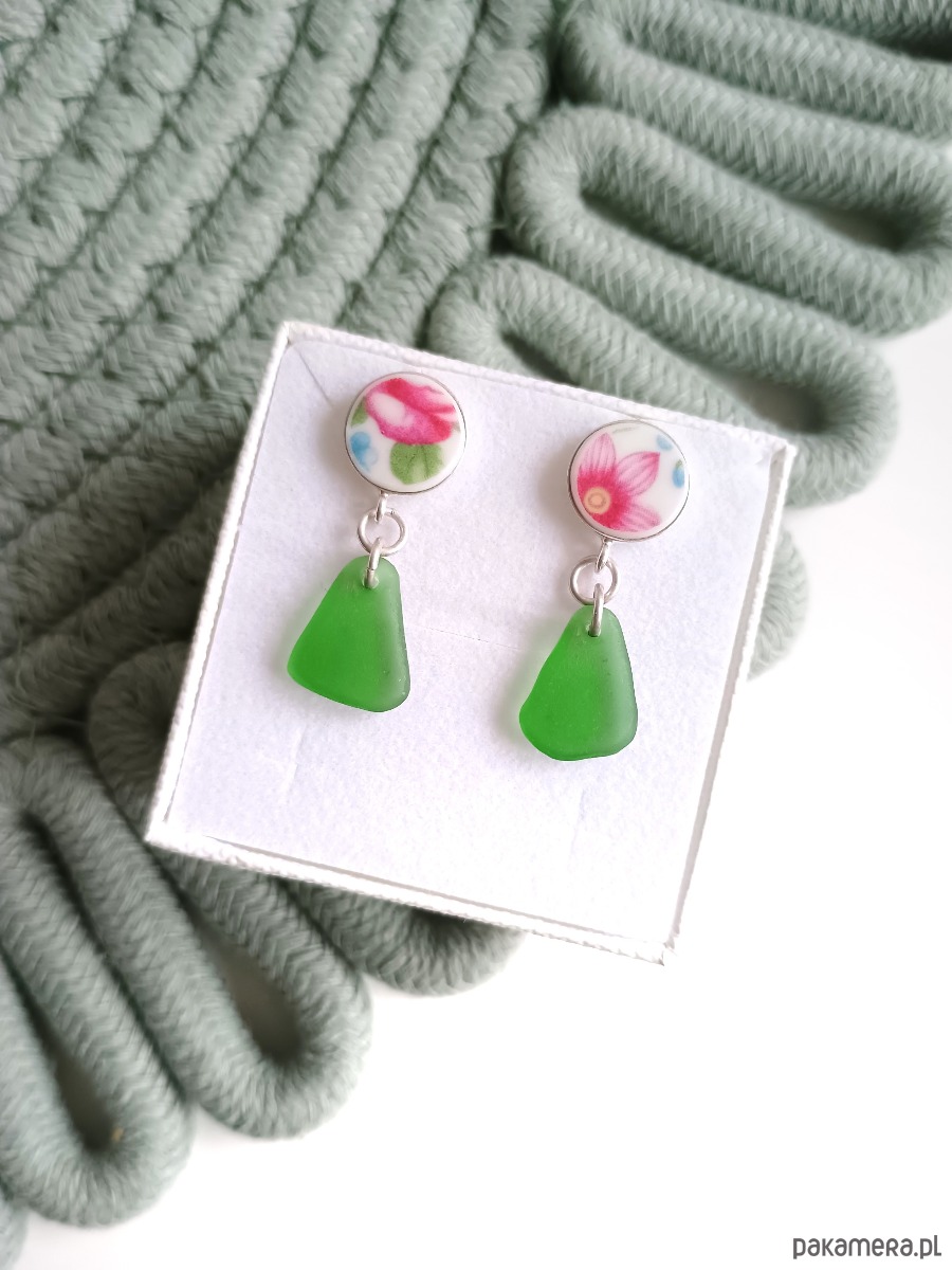 Kolczyki ceramiczne w kwiaty + szkło z morza