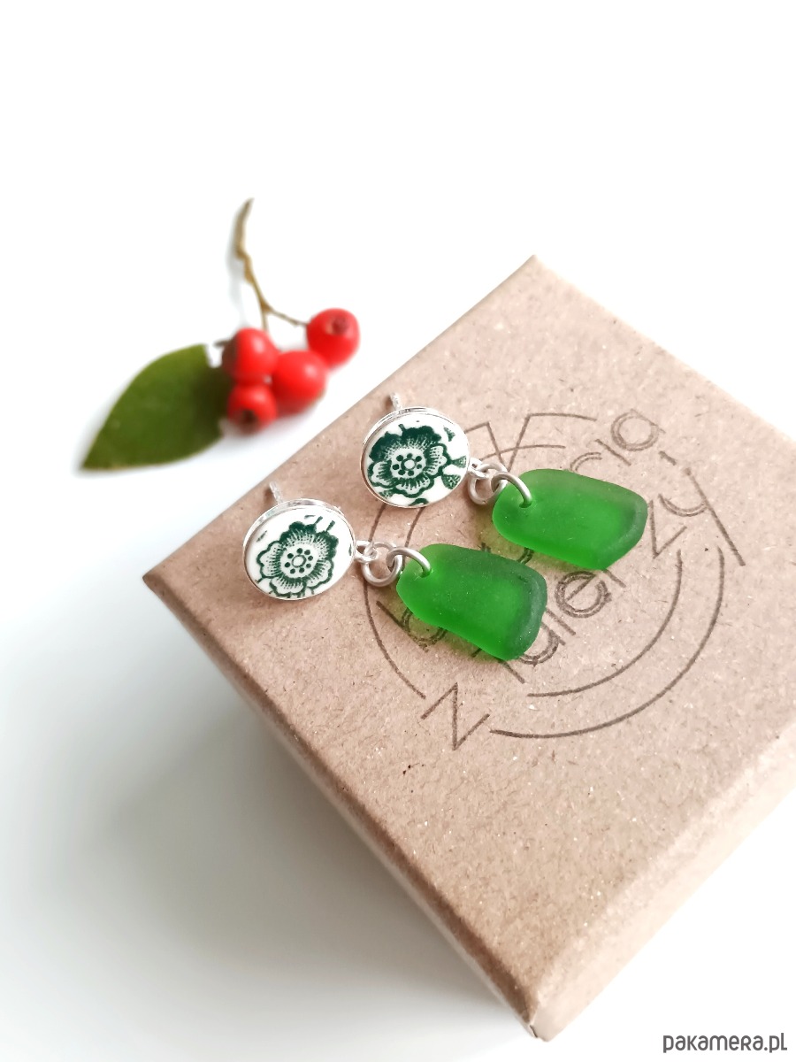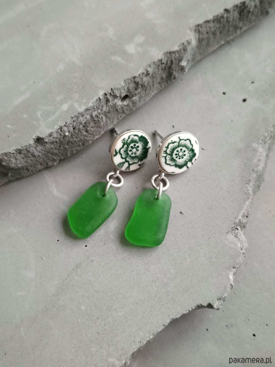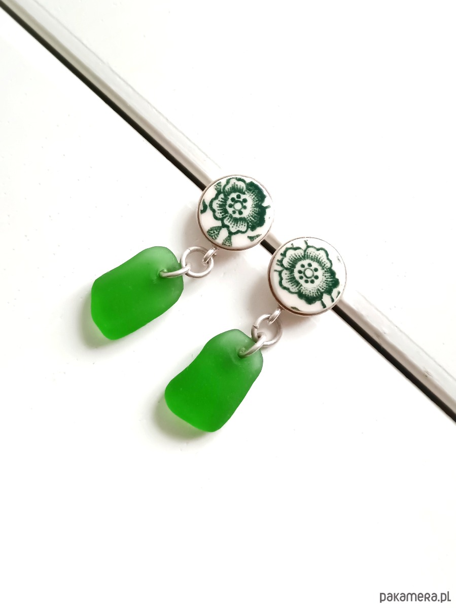 Kolczyki ceramiczne w kwiaty + szkło z morza