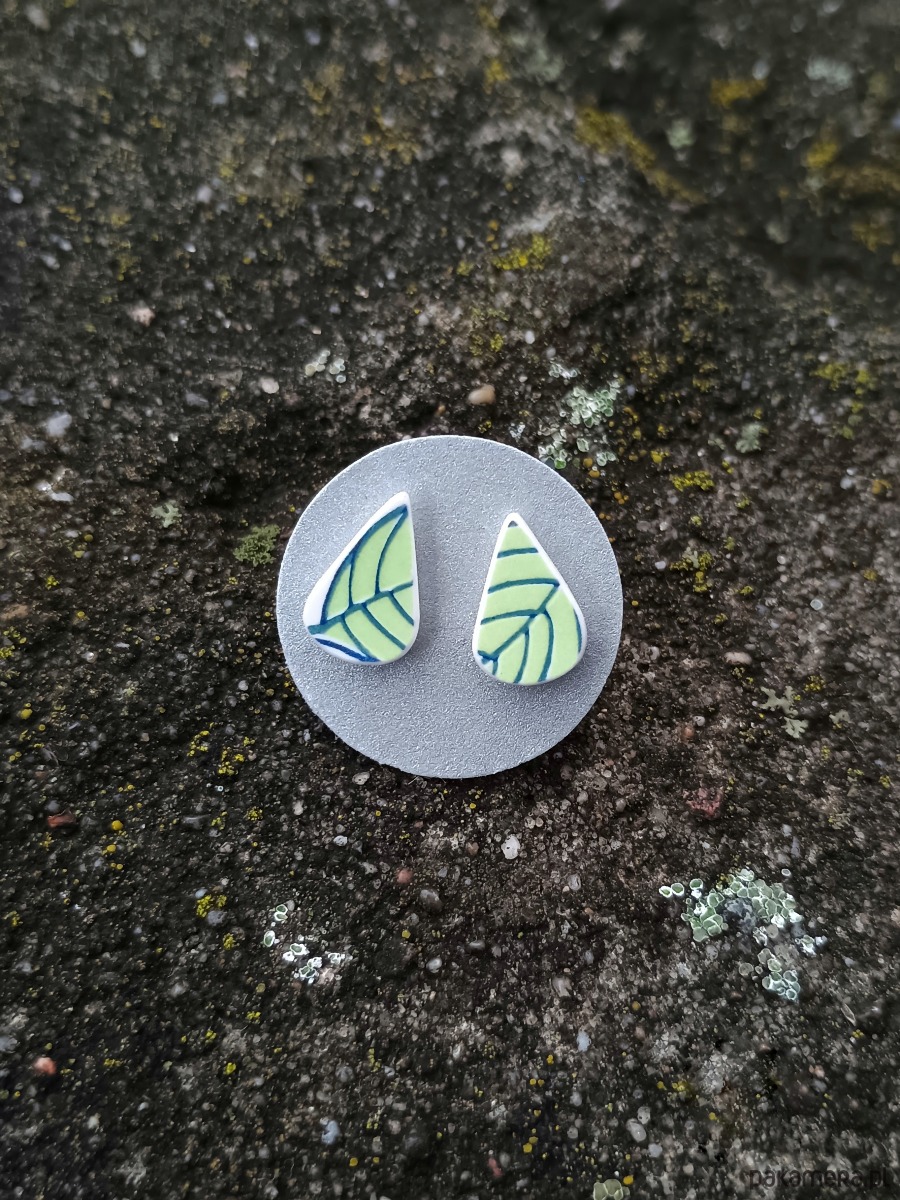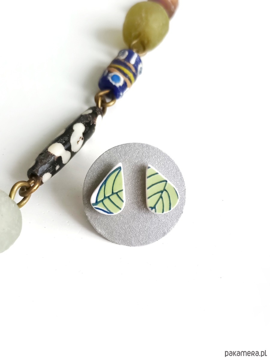 Nieduże kolczyki - łezki, które wykonałam z fragmentów stłuczonego talerza z roślinnym motywem w pastelowym kolorze. Kawałki stłuczki oszlifowałam i połączyłam ze srebrnymi sztyftami. Ceramikę zeszlifowałam również z grubości - jest cieńsza niż pierwotnie, dzięki czemu kolczyki nie są masywne. Brzegi i tył pokryłam lakierem, co sprawia, że nie brudzą się i nie chłoną wilgoci. Sztyfty oraz baranki (zapięcia) wykonane są ze srebra próby 925 - wyrób jest antyalergiczny. Wymiary elementów ceramicznych: 7 x 11 mm. Unikat - każdy z moich wyrobów występuje w jednym egzemplarzu. Upcykling - nie reprodukuję wykorzystywanych wzorów, niczego nie domalowuję - wykorzystuję wyłącznie oryginalne naczynia i motywy, które się na nich znajdują. Tym samym, stłuczce z odzysku nadaję nowe życie.