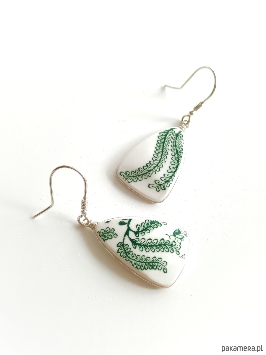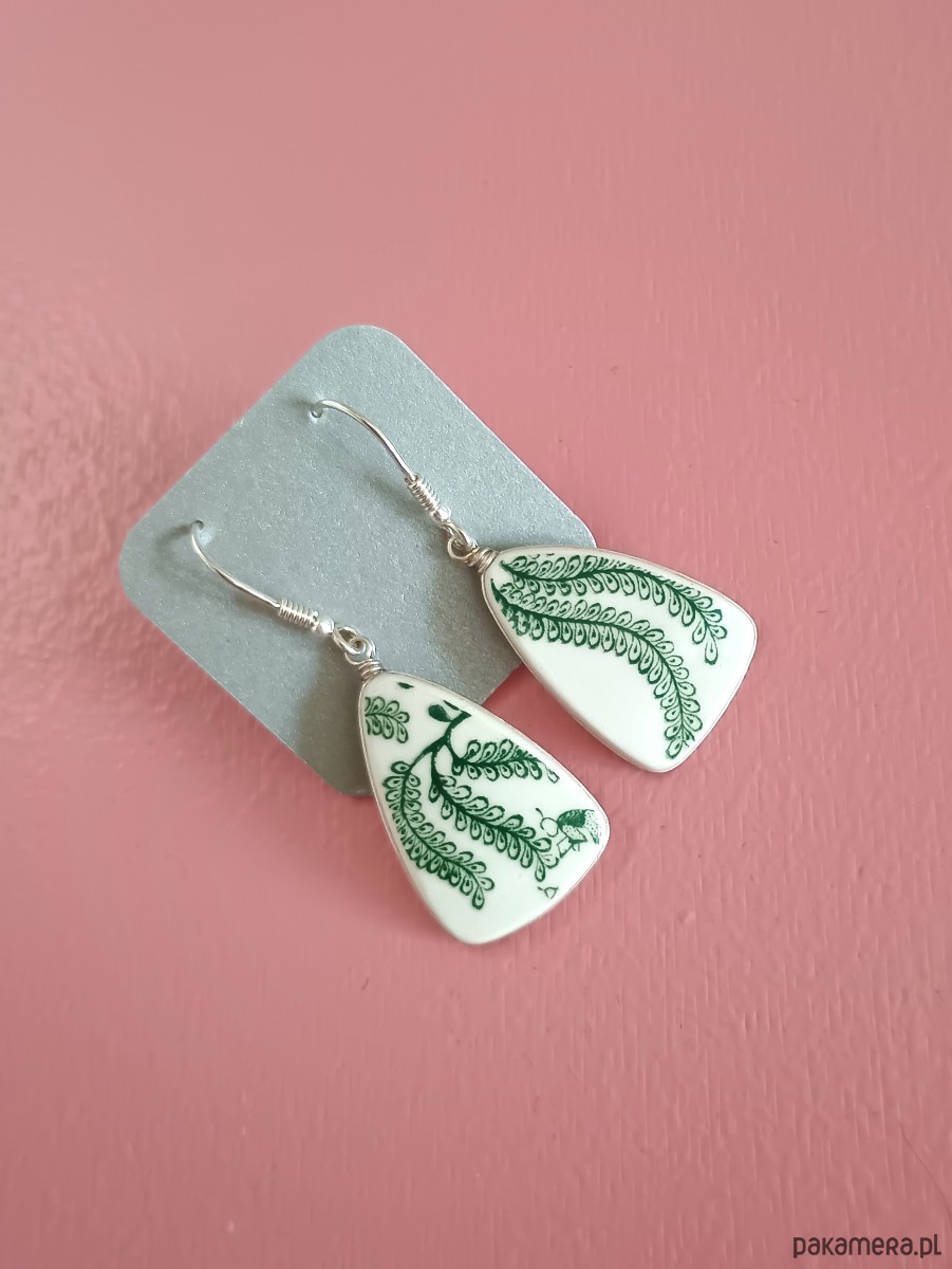 Podłużne trójkątne wiszące kolczyki, które wykonałam z fragmentów stłuczonego talerza z fajansu angielskiego w zielone wzory roślinne. Kawałki stłuczki oszlifowałam, oprawiłam w drucik i połączyłam ze srebrnymi biglami. Ceramikę zeszlifowałam również z grubości - jest cieńsza niż pierwotnie, dzięki czemu kolczyki nie są masywne. Brzegi i tył pokryłam lakierem, co sprawia, że nie brudzą się i nie chłoną wilgoci. Oprawa oraz bigle (zapięcia) wykonane są ze srebra próby 925 - wyrób jest antyalergiczny. Wymiary elementów ceramicznych: 17 x 25 mm. Waga jednego kolczyka: 2,2 g. Unikat - każdy z moich wyrobów występuje w jednym egzemplarzu. Upcykling - nie reprodukuję wykorzystywanych wzorów, niczego nie domalowuję - wykorzystuję wyłącznie oryginalne naczynia i motywy, które się na nich znajdują. Tym samym, stłuczce z odzysku nadaję nowe życie.