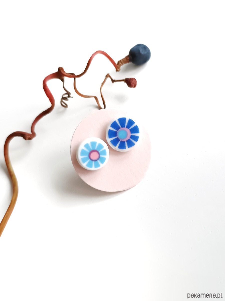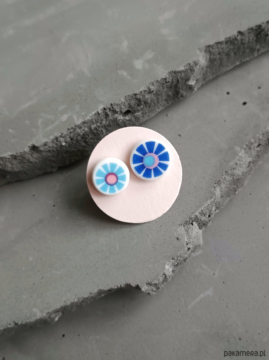 Nieduże asymetryczne okrągłe kolczyki, które wykonałam z fragmentów stłuczonego talerza w łowickie wzory. Kawałki stłuczki oszlifowałam i połączyłam ze srebrnymi sztyftami. Ceramikę zeszlifowałam również z grubości - jest cieńsza niż pierwotnie, dzięki czemu kolczyki nie są masywne. Brzegi pokryłam lakierem, co sprawia, że nie brudzą się i nie chłoną wilgoci. Sztyfty oraz baranki (zapięcia) wykonane są ze srebra próby 925 - wyrób jest antyalergiczny. Średnica elementów ceramicznych: 9 i 10 mm. Unikat - każdy z moich wyrobów występuje w jednym egzemplarzu. Upcykling - nie reprodukuję wykorzystywanych wzorów, niczego nie domalowuję - wykorzystuję wyłącznie oryginalne naczynia i motywy, które się na nich znajdują. Tym samym, stłuczce z odzysku nadaję nowe życie.