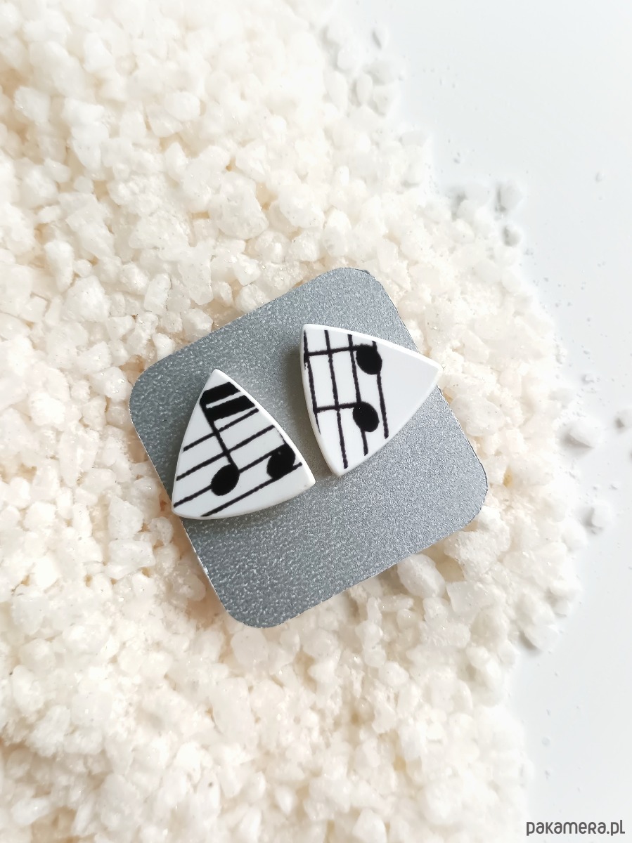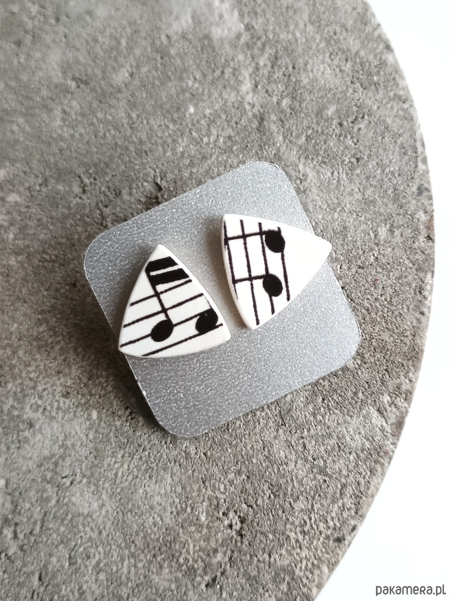 Spore trójkątne kolczyki, które wykonałam z fragmentów stłuczonego talerza w nuty. Kawałki stłuczki oszlifowałam i połączyłam ze srebrnymi sztyftami. Ceramikę zeszlifowałam również z grubości - jest cieńsza niż pierwotnie, dzięki czemu kolczyki nie są masywne. Brzegi i tył pokryłam lakierem, co sprawia, że nie brudzą się i nie chłoną wilgoci. Sztyfty oraz baranki (zapięcia) wykonane są ze srebra próby 925 - wyrób jest antyalergiczny. Wymiary elementów ceramicznych: 16 x 16 mm. Unikat - każdy z moich wyrobów występuje w jednym egzemplarzu. Upcykling - nie reprodukuję wykorzystywanych wzorów, niczego nie domalowuję - wykorzystuję wyłącznie oryginalne naczynia i motywy, które się na nich znajdują. Tym samym, stłuczce z odzysku nadaję nowe życie.