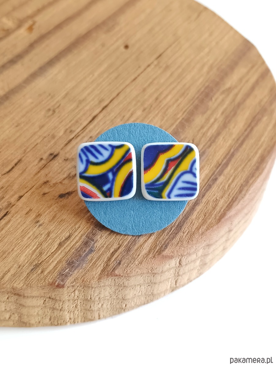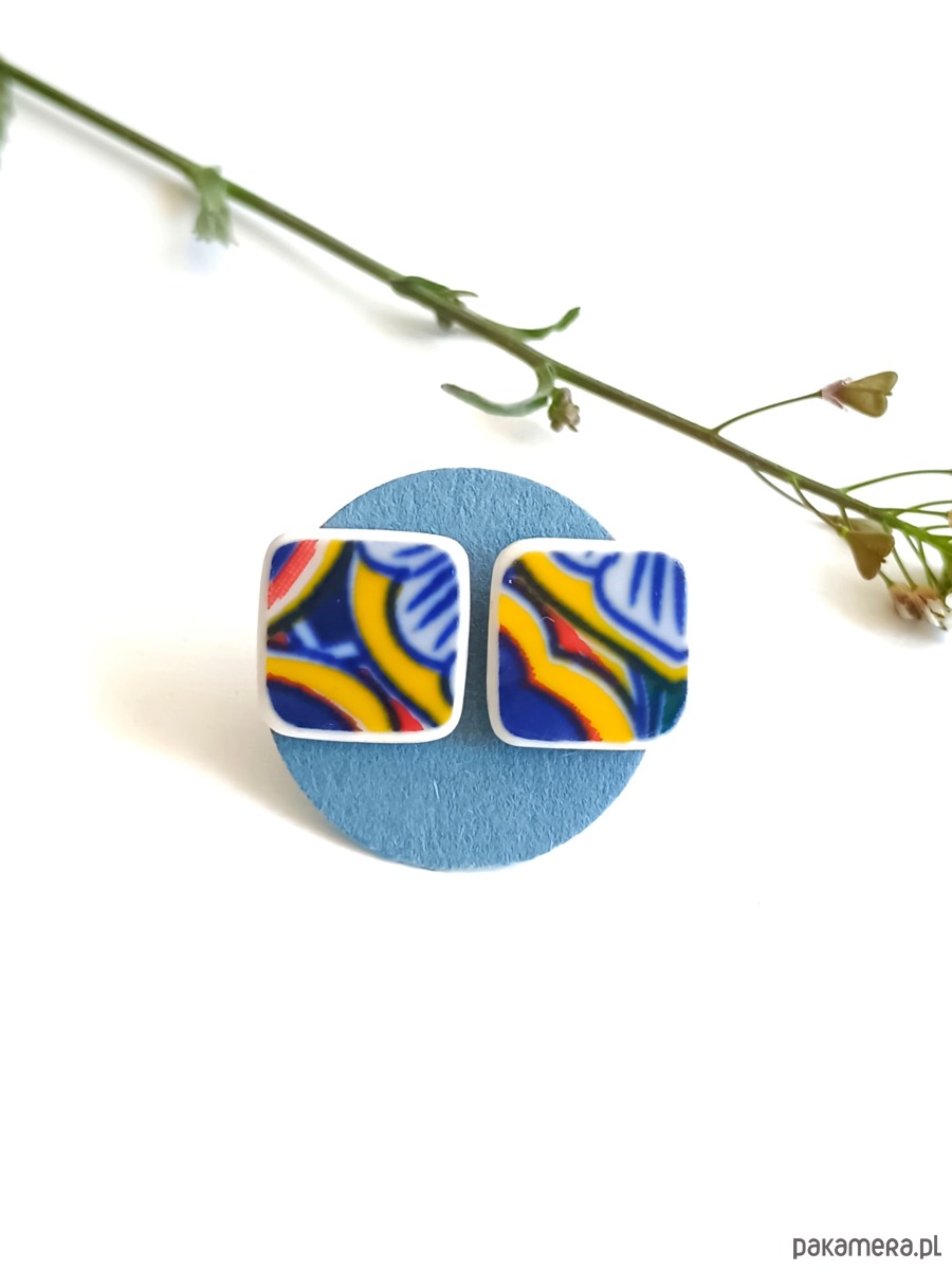 Nieduże kolczyki, które wykonałam z fragmentów stłuczonego talerza w orientalne wzory. Kawałki stłuczki oszlifowałam w kwadratowe kształty i połączyłam ze srebrnymi sztyftami. Ceramikę zeszlifowałam również z grubości - jest cieńsza niż pierwotnie, dzięki czemu kolczyki nie są masywne. Brzegi i tył pokryłam lakierem, co sprawia, że nie brudzą się i nie chłoną wilgoci. Sztyfty oraz baranki (zapięcia) wykonane są ze srebra próby 925 - wyrób jest antyalergiczny. Wymiary elementów ceramicznych: 11 x 11 mm. Unikat - każdy z moich wyrobów występuje w jednym egzemplarzu. Upcykling - nie reprodukuję wykorzystywanych wzorów, niczego nie domalowuję - wykorzystuję wyłącznie oryginalne naczynia i motywy, które się na nich znajdują. Tym samym, stłuczce z odzysku nadaję nowe życie.