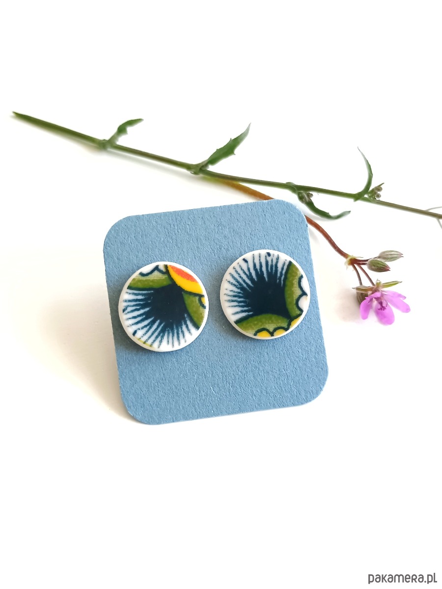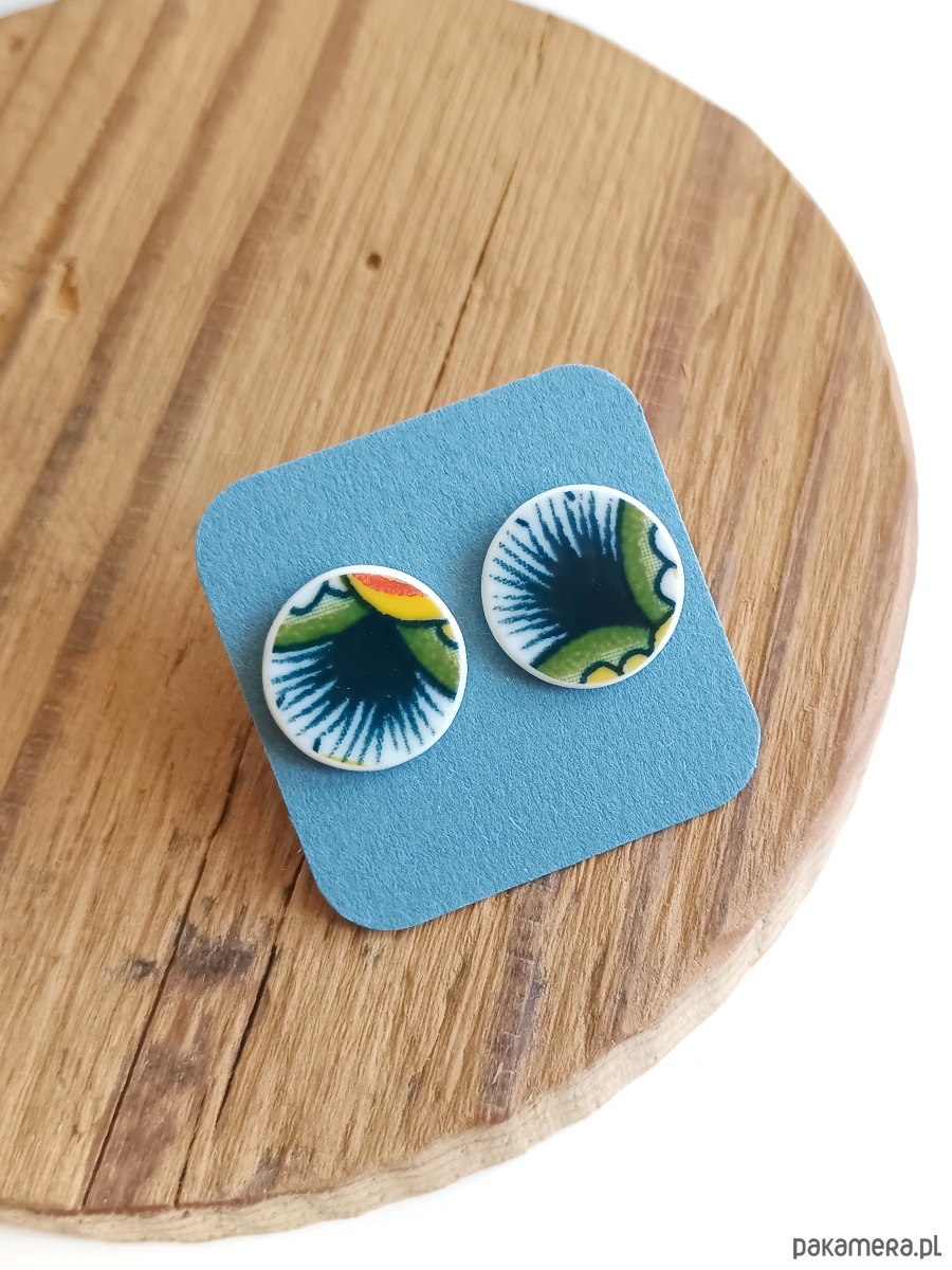 Okrągłe kolczyki, które wykonałam z fragmentów stłuczonego talerza w orientalne wzory. Kawałki stłuczki oszlifowałam i połączyłam ze srebrnymi sztyftami. Ceramikę zeszlifowałam również z grubości - jest cieńsza niż pierwotnie, dzięki czemu kolczyki nie są masywne. Brzegi i tył pokryłam lakierem, co sprawia, że nie brudzą się i nie chłoną wilgoci. Sztyfty oraz baranki (zapięcia) wykonane są ze srebra próby 925 - wyrób jest antyalergiczny. Średnica elementów ceramicznych: 14 mm. Unikat - każdy z moich wyrobów występuje w jednym egzemplarzu. Upcykling - nie reprodukuję wykorzystywanych wzorów, niczego nie domalowuję - wykorzystuję wyłącznie oryginalne naczynia i motywy, które się na nich znajdują. Tym samym, stłuczce z odzysku nadaję nowe życie.