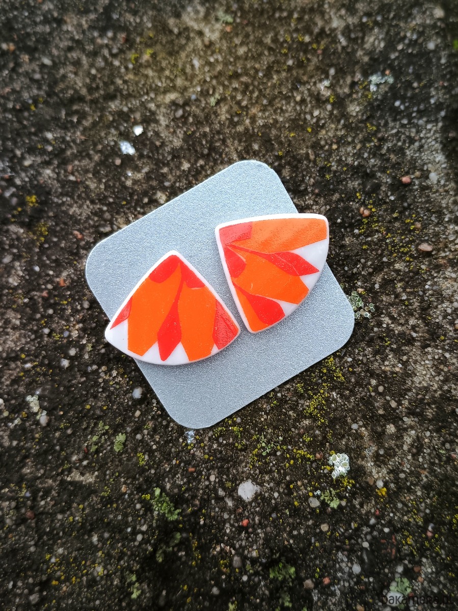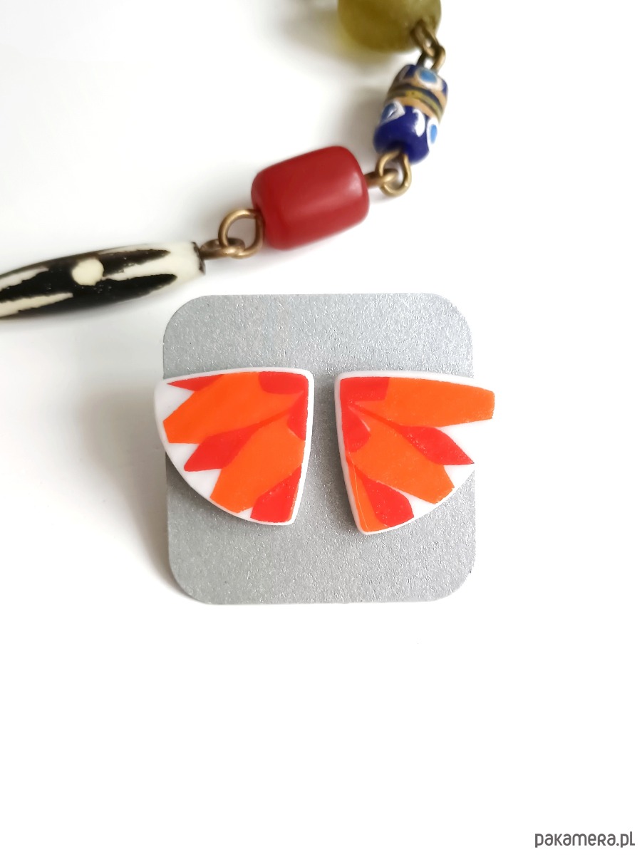 Spore kolczyki, które wykonałam z fragmentów stłuczonej filiżanki z pomarańczowym kwiatkiem. Kawałki stłuczki oszlifowałam trójkątne kształty i połączyłam ze srebrnymi sztyftami. Ceramikę zeszlifowałam również z grubości - jest cieńsza niż pierwotnie, dzięki czemu kolczyki nie są masywne. Brzegi pokryłam lakierem, co sprawia, że nie brudzą się i nie chłoną wilgoci. Sztyfty oraz baranki (zapięcia) wykonane są ze srebra próby 925 - wyrób jest antyalergiczny. Wymiary elementów ceramicznych: 18 x 18 mm. Unikat - każdy z moich wyrobów występuje w jednym egzemplarzu. Upcykling - nie reprodukuję wykorzystywanych wzorów, niczego nie domalowuję - wykorzystuję wyłącznie oryginalne naczynia i motywy, które się na nich znajdują. Tym samym, stłuczce z odzysku nadaję nowe życie.