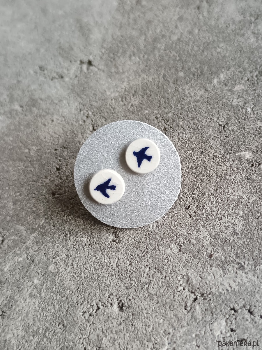 Malutkie okrągłe kolczyki, które wykonałam z fragmentów stłuczonego talerza z motywem pejzażu z ptakami. Kawałki stłuczki oszlifowałam i połączyłam ze srebrnymi sztyftami. Ceramikę zeszlifowałam również z grubości - jest cieńsza niż pierwotnie, dzięki czemu kolczyki nie są masywne. Brzegi i tył pokryłam lakierem, co sprawia, że nie brudzą się i nie chłoną wilgoci. Sztyfty oraz baranki (zapięcia) wykonane są ze srebra próby 925 - wyrób jest antyalergiczny. Średnica elementów ceramicznych: 7 mm. Unikat - każdy z moich wyrobów występuje w jednym egzemplarzu. Upcykling - nie reprodukuję wykorzystywanych wzorów, niczego nie domalowuję - wykorzystuję wyłącznie oryginalne naczynia i motywy, które się na nich znajdują. Tym samym, stłuczce z odzysku nadaję nowe życie.