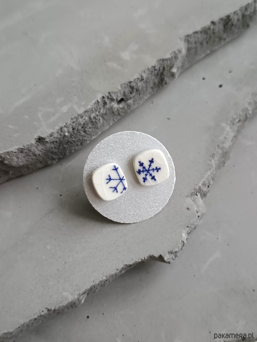 Nieduże prostokątne kolczyki, które wykonałam z fragmentów stłuczonego talerza z zimowym pejzażem. Kawałki stłuczki oszlifowałam i połączyłam ze srebrnymi sztyftami. Ceramikę zeszlifowałam również z grubości - jest cieńsza niż pierwotnie, dzięki czemu kolczyki nie są masywne. Brzegi pokryłam lakierem, co sprawia, że nie brudzą się i nie chłoną wilgoci. Sztyfty oraz baranki (zapięcia) wykonane są ze srebra próby 925 - wyrób jest antyalergiczny. Wymiary elementów ceramicznych: 8 x 9 mm. Unikat - każdy z moich wyrobów występuje w jednym egzemplarzu. Upcykling - nie reprodukuję wykorzystywanych wzorów, niczego nie domalowuję - wykorzystuję wyłącznie oryginalne naczynia i motywy, które się na nich znajdują. Tym samym, stłuczce z odzysku nadaję nowe życie.
