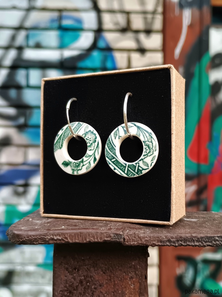 Oto wiszące kolczyki, które wykonałam z fragmentów stłuczonej filiżanki fajansowej Villeroy & Boch w zielone wzory kwiatowe, które znajdowały się zarówno wewnątrz jak i na zewnątrz. Kawałki ceramiki oszlifowałam w okrągłe kształty i połączyłam ze srebrnymi zapięciami. Brzegi pokryłam lakierem, co sprawia, że nie brudzą się i nie chłoną wilgoci. Zapięcie, czyli koła o średnicy 19 mm wykonane są ze srebra próby 925 - wyrób jest antyalergiczny. Średnica elementów ceramicznych: 22 mm. Waga jednego kolczyka: 2,2 g. Unikat - każdy z moich wyrobów występuje w jednym egzemplarzu. Upcykling - nie reprodukuję wykorzystywanych wzorów, niczego nie domalowuję - wykorzystuję wyłącznie oryginalne naczynia i motywy, które się na nich znajdują. Tym samym, stłuczce z odzysku nadaję nowe życie.