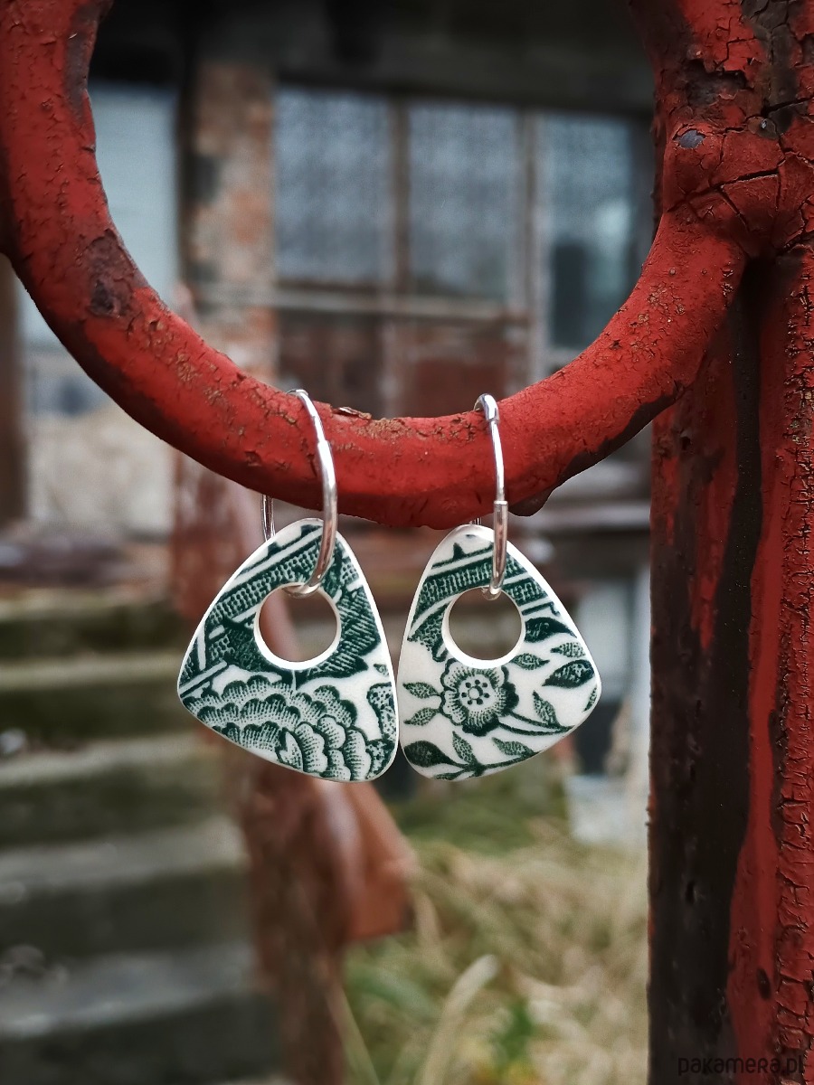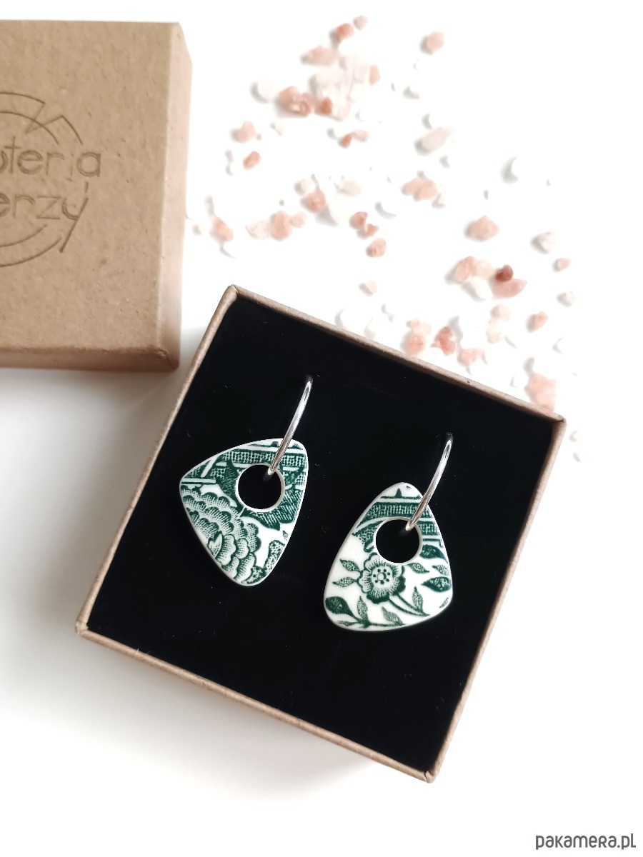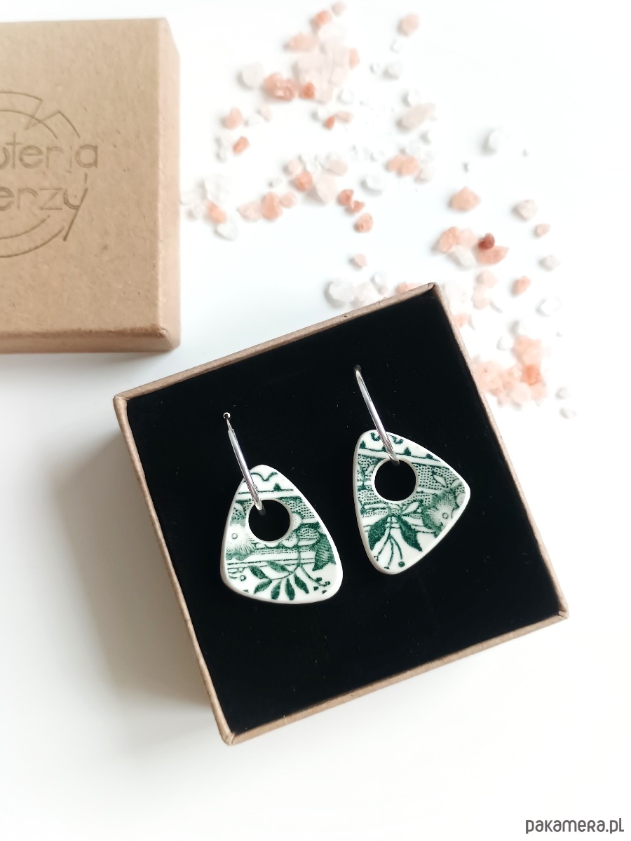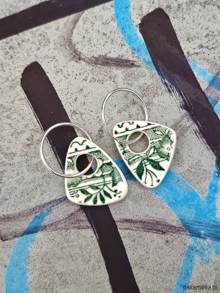 Oto wiszące kolczyki, które wykonałam z fragmentów stłuczonej filiżanki fajansowej Villeroy & Boch w zielone wzory kwiatowe, które znajdowały się zarówno wewnątrz jak i na zewnątrz. Kawałki ceramiki oszlifowałam w opływowe trójkątne kształty i połączyłam ze srebrnymi zapięciami. Brzegi pokryłam lakierem, co sprawia, że nie brudzą się i nie chłoną wilgoci. Zapięcie, czyli koła o średnicy 19 mm wykonane są ze srebra próby 925 - wyrób jest antyalergiczny. Wymiary elementów ceramicznych: 20 x 25 mm. Waga jednego kolczyka: 2,4 g. Unikat - każdy z moich wyrobów występuje w jednym egzemplarzu. Upcykling - nie reprodukuję wykorzystywanych wzorów, niczego nie domalowuję - wykorzystuję wyłącznie oryginalne naczynia i motywy, które się na nich znajdują. Tym samym, stłuczce z odzysku nadaję nowe życie.