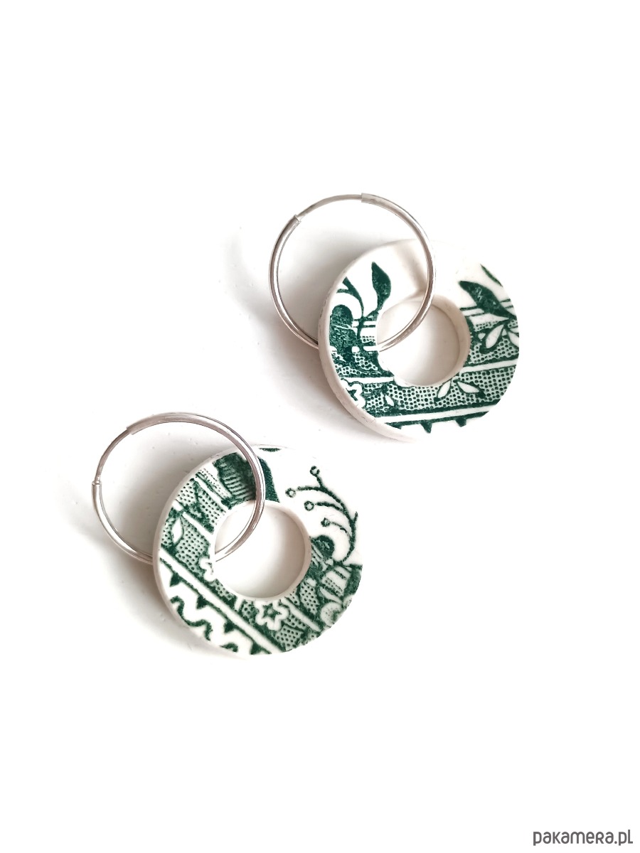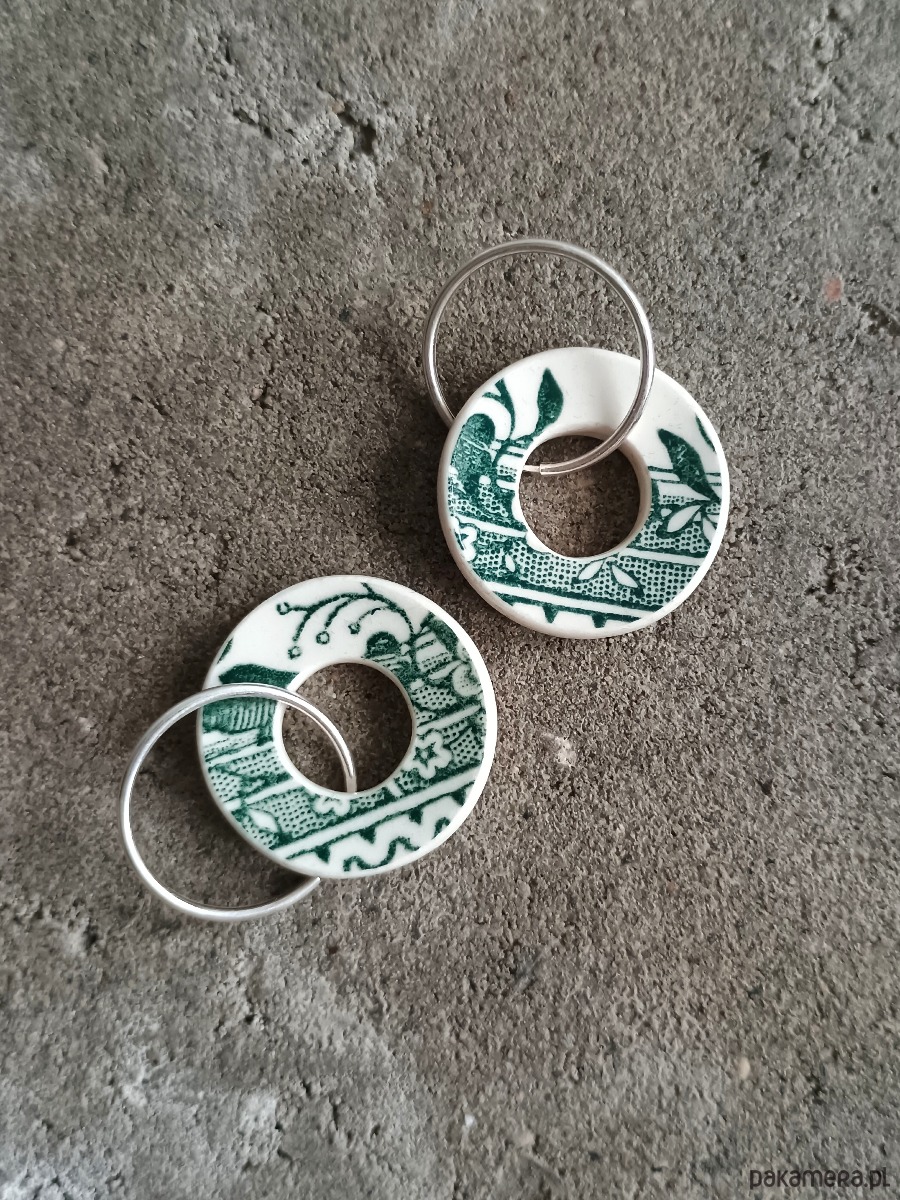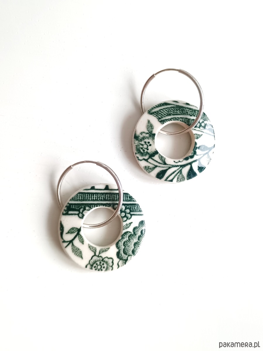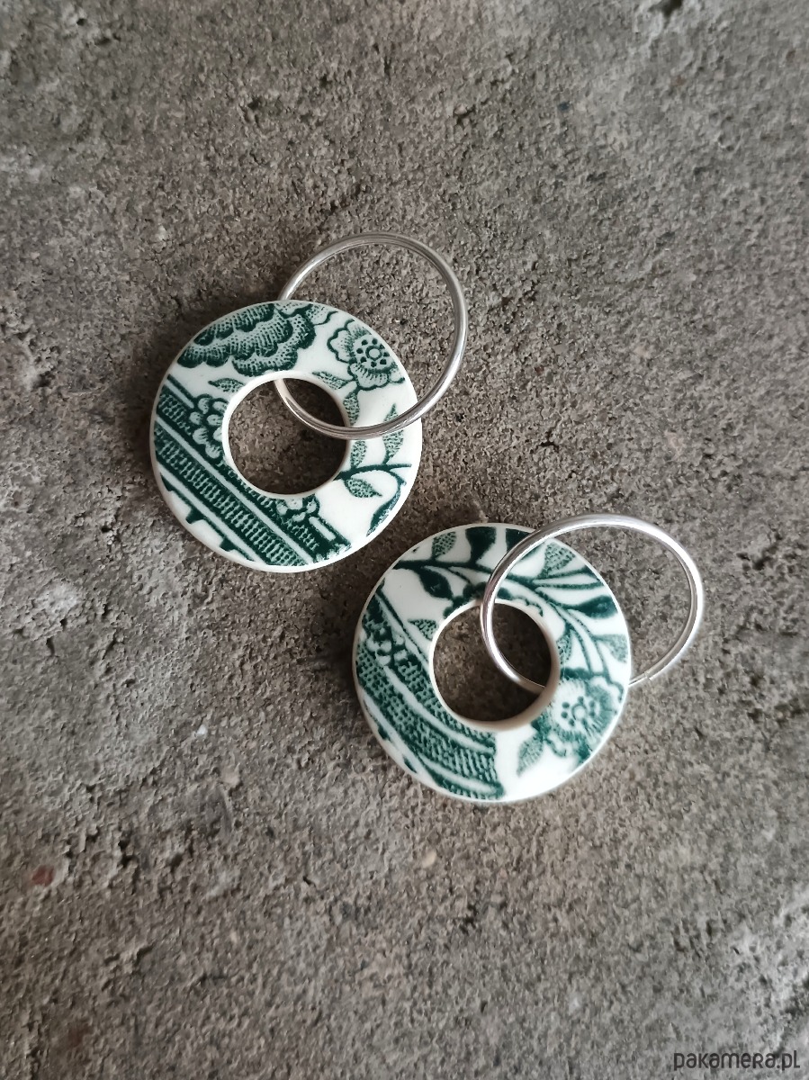 Oto wiszące kolczyki, które wykonałam z fragmentów stłuczonej filiżanki fajansowej Villeroy & Boch w zielone wzory kwiatowe, które znajdowały się zarówno wewnątrz jak i na zewnątrz. Kawałki ceramiki oszlifowałam w okrągłe kształty i połączyłam ze srebrnymi zapięciami. Brzegi pokryłam lakierem, co sprawia, że nie brudzą się i nie chłoną wilgoci. Zapięcie, czyli koła o średnicy 19 mm wykonane są ze srebra próby 925 - wyrób jest antyalergiczny. Średnica elementów ceramicznych: 24 mm. Waga jednego kolczyka: 3,1 g. Unikat - każdy z moich wyrobów występuje w jednym egzemplarzu. Upcykling - nie reprodukuję wykorzystywanych wzorów, niczego nie domalowuję - wykorzystuję wyłącznie oryginalne naczynia i motywy, które się na nich znajdują. Tym samym, stłuczce z odzysku nadaję nowe życie.