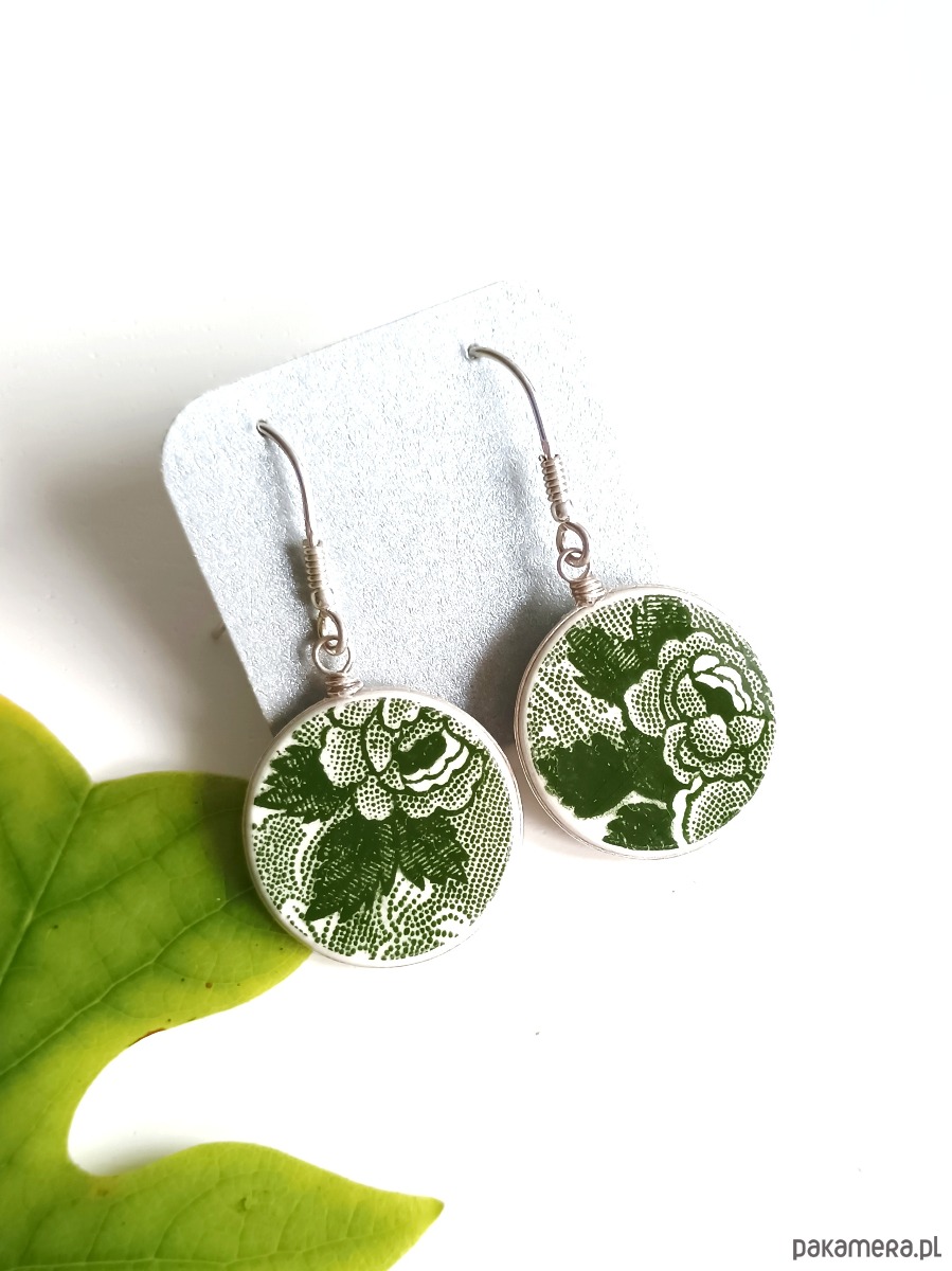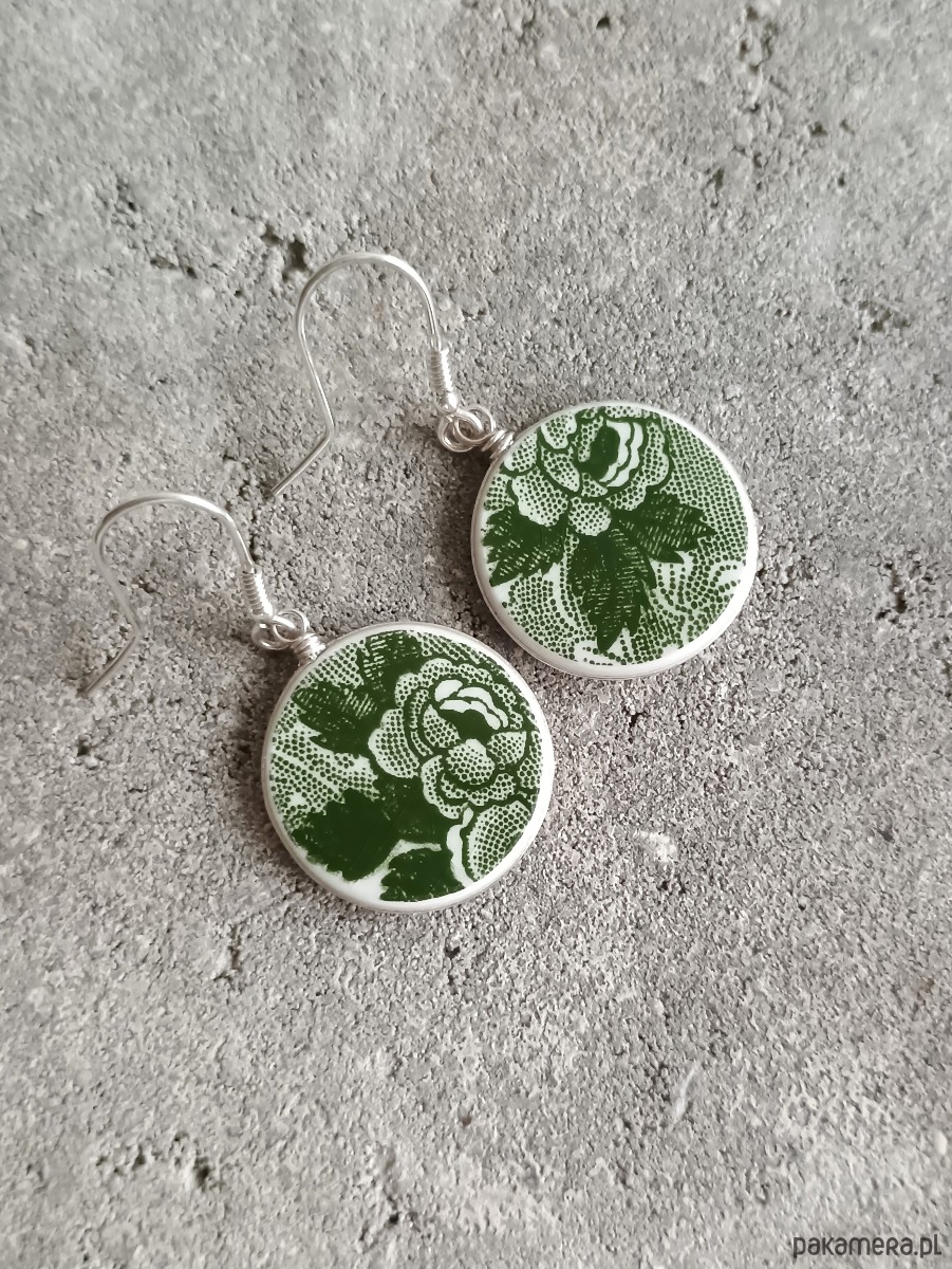 Okrągłe wiszące kolczyki, które wykonałam z fragmentów stłuczonego talerza z fajansu angielskiego w zielone wzory roślinne. Kawałki stłuczki oszlifowałam, oprawiłam w drucik i połączyłam ze srebrnymi biglami. Ceramikę zeszlifowałam również z grubości - jest cieńsza niż pierwotnie, dzięki czemu kolczyki nie są masywne. Brzegi i tył pokryłam lakierem, co sprawia, że nie brudzą się i nie chłoną wilgoci. Oprawa oraz bigle (zapięcia) wykonane są ze srebra próby 925 - wyrób jest antyalergiczny. Średnica elementów ceramicznych: 21 mm. Waga jednego kolczyka: 2,4 g. Unikat - każdy z moich wyrobów występuje w jednym egzemplarzu. Upcykling - nie reprodukuję wykorzystywanych wzorów, niczego nie domalowuję - wykorzystuję wyłącznie oryginalne naczynia i motywy, które się na nich znajdują. Tym samym, stłuczce z odzysku nadaję nowe życie.
