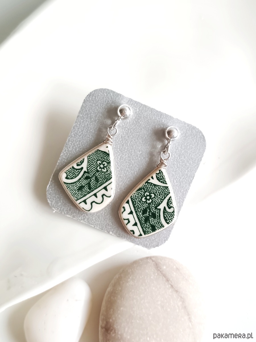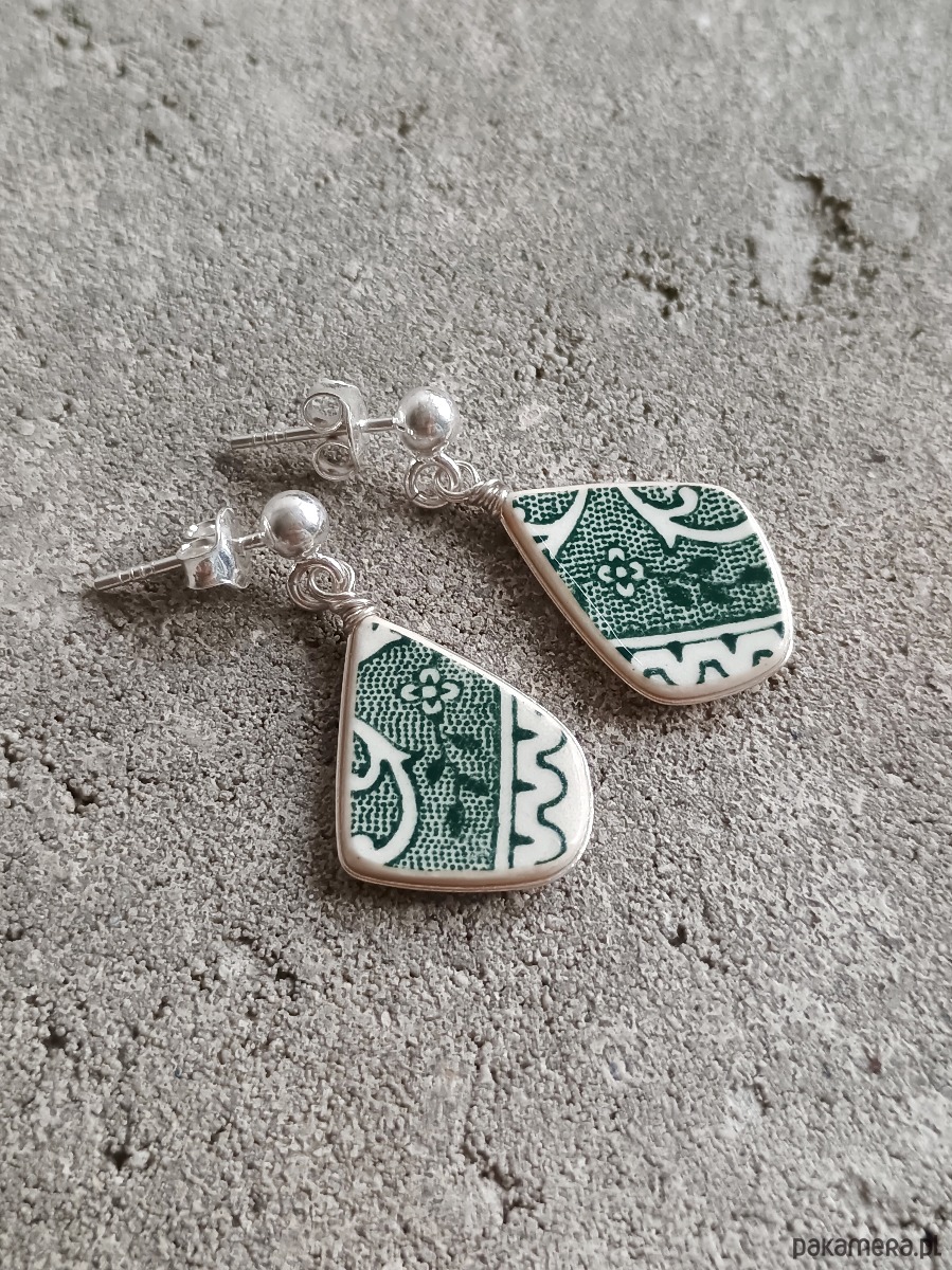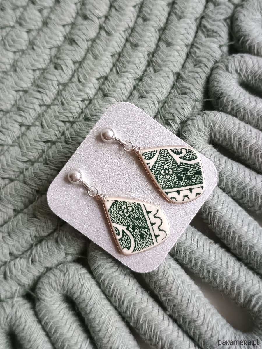 Delikatne wiszące kolczyki, które wykonałam z fragmentów stłuczonego talerza Villeroy & Boch w zielone motywy roślinne. Kawałki stłuczki oszlifowałam w kształt łezek, oprawiłam w drucik i połączyłam ze srebrnymi sztyftami. Porcelanę zeszlifowałam również z grubości - jest cieńsza niż pierwotnie, dzięki czemu kolczyki nie są masywne. Brzegi i tył pokryłam lakierem, co sprawia, że nie brudzą się i nie chłoną wilgoci. Sztyfty, baranki oraz oprawa wykonane są ze srebra próby 925 - wyrób jest antyalergiczny. Wymiary elementów ceramicznych: 13 x 19 mm. Waga jednego kolczyka: 1,0 g. Unikat - każdy z moich wyrobów występuje w jednym egzemplarzu. Upcykling - nie reprodukuję wykorzystywanych wzorów, niczego nie domalowuję - wykorzystuję wyłącznie oryginalne naczynia i motywy, które się na nich znajdują. Tym samym, stłuczce z odzysku nadaję nowe życie.