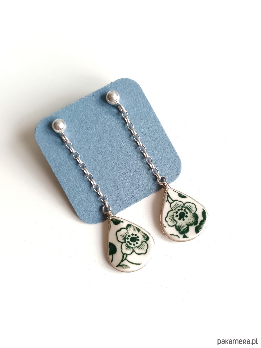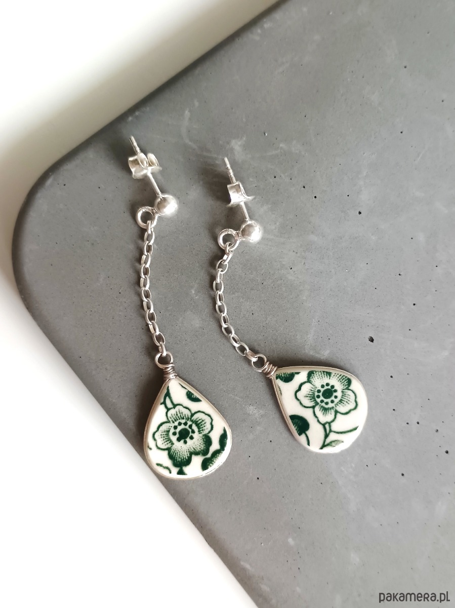 Nieduże wiszące kolczyki, które wykonałam z fragmentów stłuczonego talerza Villeroy & Boch w zielone motywy roślinne. Kawałki stłuczki oszlifowałam w kształty łezek, oprawiłam w drucik i połączyłam ze srebrnym łańcuszkiem i sztyftami. Porcelanę zeszlifowałam również z grubości - jest cieńsza niż pierwotnie, dzięki czemu kolczyki nie są masywne. Brzegi i tył pokryłam lakierem, co sprawia, że nie brudzą się i nie chłoną wilgoci. Sztyfty, baranki, łańcuszek oraz oprawa wykonane są ze srebra próby 925 - wyrób jest antyalergiczny. Wymiary elementów ceramicznych: 13 x 16 mm. Długość całego kolczyka: 48 mm. Waga jednego kolczyka: 1,2 g. Unikat - każdy z moich wyrobów występuje w jednym egzemplarzu. Upcykling - nie reprodukuję wykorzystywanych wzorów, niczego nie domalowuję - wykorzystuję wyłącznie oryginalne naczynia i motywy, które się na nich znajdują. Tym samym, stłuczce z odzysku nadaję nowe życie.