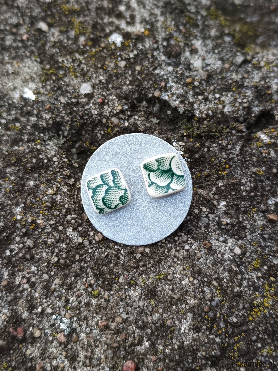 Nieduże kwadratowe kolczyki, które wykonałam z fragmentów stłuczonego talerza Villeroy & Boch w ciemnozielone wzory. Kawałki stłuczki oszlifowałam i połączyłam ze srebrnymi sztyftami. Ceramikę zeszlifowałam również z grubości - jest cieńsza niż pierwotnie, dzięki czemu kolczyki nie są masywne. Brzegi i tył pokryłam lakierem, co sprawia, że nie brudzą się i nie chłoną wilgoci. Sztyfty oraz baranki (zapięcia) wykonane są ze srebra próby 925 - wyrób jest antyalergiczny. Wymiary elementów ceramicznych: 8 x 8 mm. Unikat - każdy z moich wyrobów występuje w jednym egzemplarzu. Upcykling - nie reprodukuję wykorzystywanych wzorów, niczego nie domalowuję - wykorzystuję wyłącznie oryginalne naczynia i motywy, które się na nich znajdują. Tym samym, stłuczce z odzysku nadaję nowe życie.