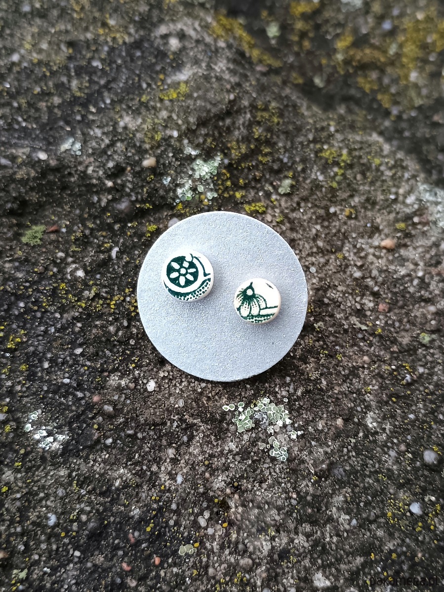 Malutkie asymetryczne okrągłe kolczyki, które wykonałam z fragmentów stłuczonego talerza Villeroy & Boch we wzory roślinne. Kawałki stłuczki oszlifowałam i połączyłam ze srebrnymi sztyftami. Ceramikę zeszlifowałam również z grubości - jest cieńsza niż pierwotnie, dzięki czemu kolczyki nie są masywne. Brzegi pokryłam lakierem, co sprawia, że nie brudzą się i nie chłoną wilgoci. Sztyfty oraz baranki (zapięcia) wykonane są ze srebra próby 925 - wyrób jest antyalergiczny. Średnica elementów ceramicznych: 6 i 7 mm. Unikat - każdy z moich wyrobów występuje w jednym egzemplarzu. Upcykling - nie reprodukuję wykorzystywanych wzorów, niczego nie domalowuję - wykorzystuję wyłącznie oryginalne naczynia i motywy, które się na nich znajdują. Tym samym, stłuczce z odzysku nadaję nowe życie.