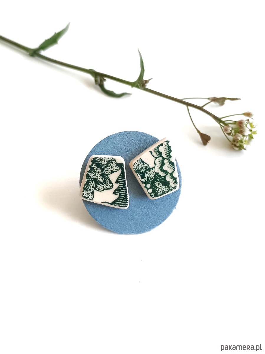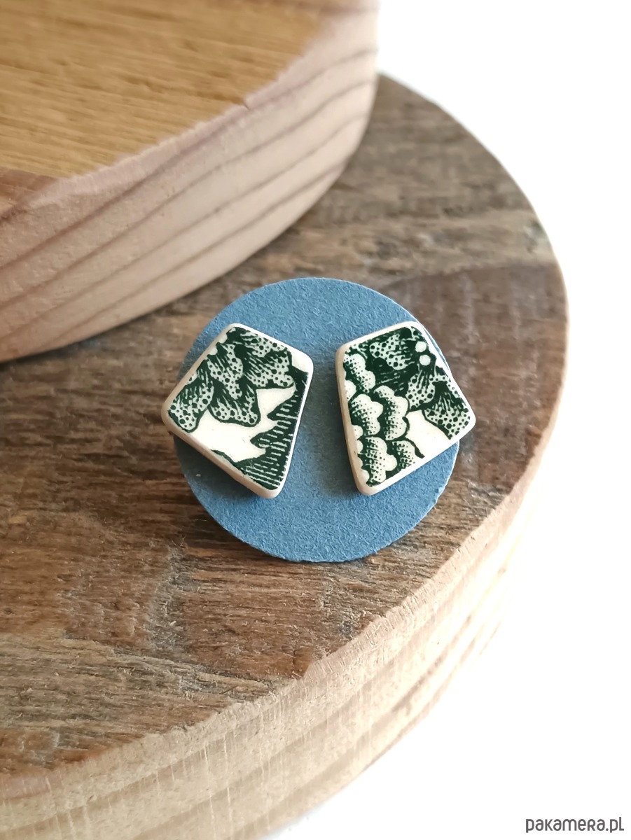 Nieduże kolczyki, które wykonałam z fragmentów stłuczonego talerza Villeroy & Boch w ciemnozielone wzory. Kawałki stłuczki oszlifowałam trapezowe nieregularne kształty i połączyłam ze srebrnymi sztyftami. Ceramikę zeszlifowałam również z grubości - jest cieńsza niż pierwotnie, dzięki czemu kolczyki nie są masywne. Brzegi i tył pokryłam lakierem, co sprawia, że nie brudzą się i nie chłoną wilgoci. Sztyfty oraz baranki (zapięcia) wykonane są ze srebra próby 925 - wyrób jest antyalergiczny. Wymiary elementów ceramicznych: 10 x 11 mm. Unikat - każdy z moich wyrobów występuje w jednym egzemplarzu. Upcykling - nie reprodukuję wykorzystywanych wzorów, niczego nie domalowuję - wykorzystuję wyłącznie oryginalne naczynia i motywy, które się na nich znajdują. Tym samym, stłuczce z odzysku nadaję nowe życie.