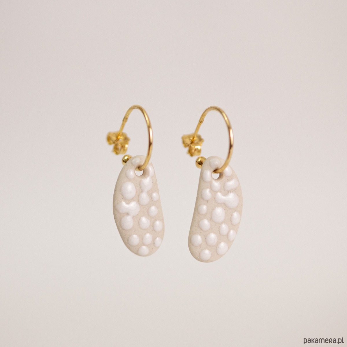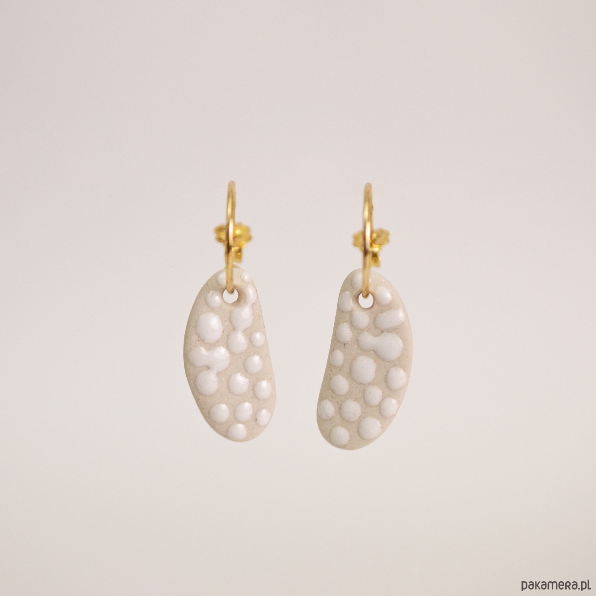Kolczyki ceramiczne z elementem ze srebra pr. 925 w kolorze delikatnego złota. Kolczyki ręcznie formowane z gliny ceramicznej z nakrapianym wzorem z białego błyszczącego szkliwa. Ceramiczne części są w kształcie dwóch podłużnych łatek. Element ceramiczny wypalony jest w wysokiej temperaturze 1250 st.C.