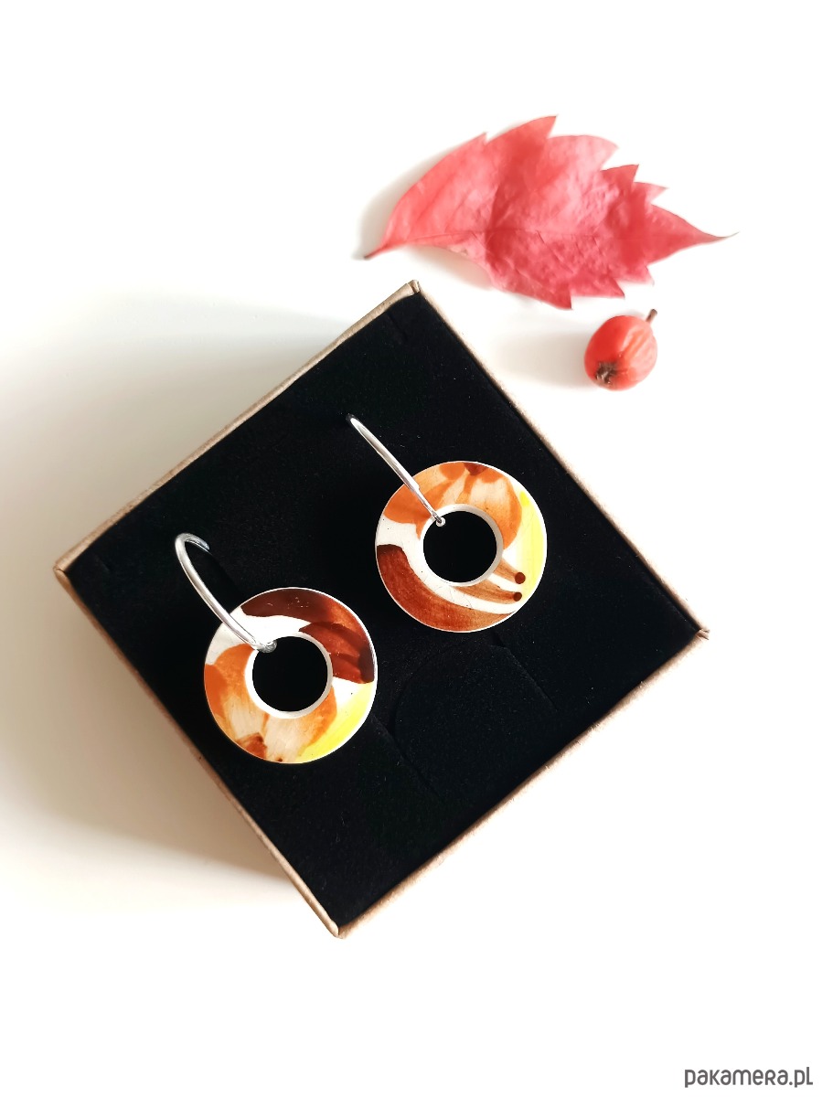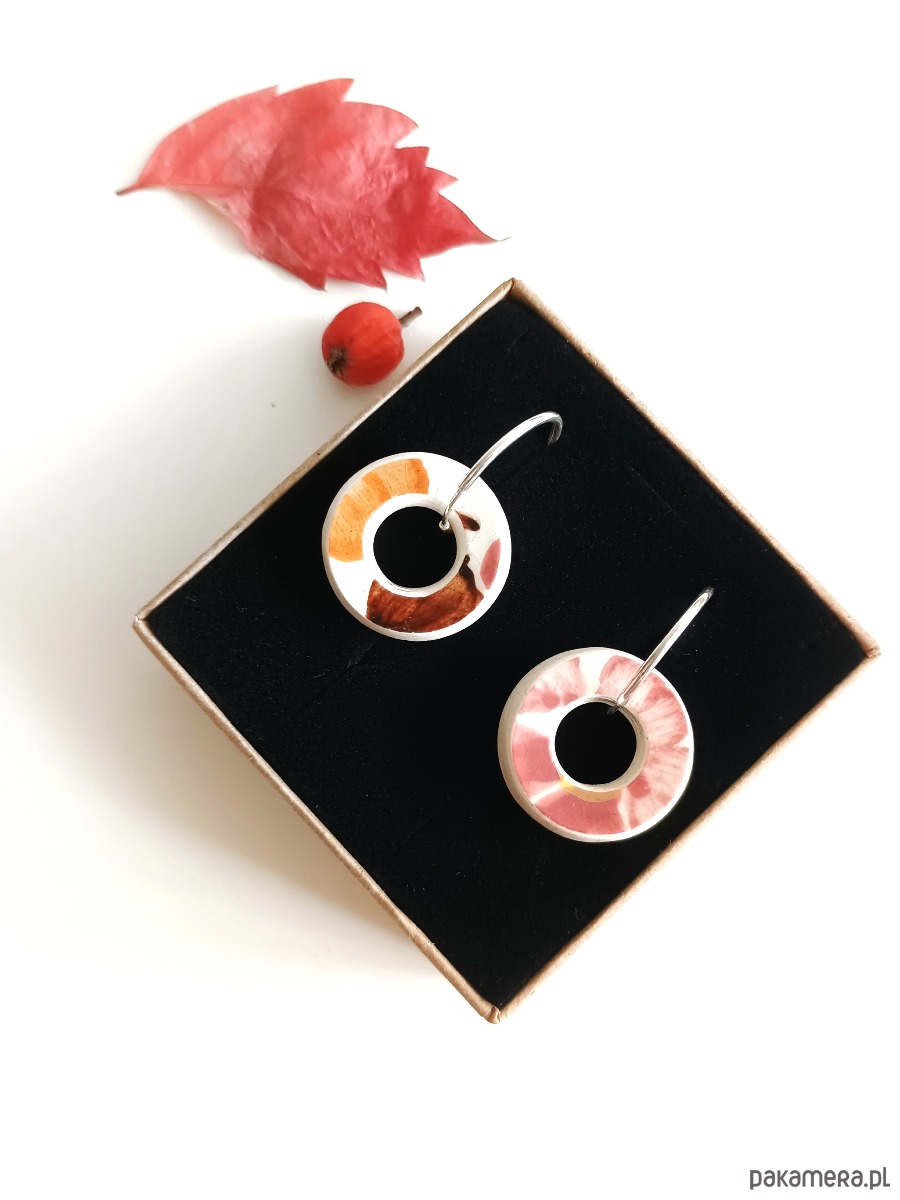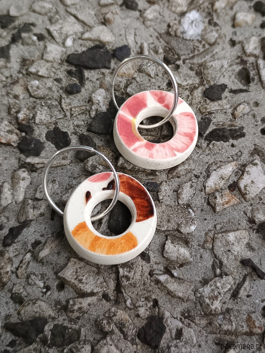 Historia fajansu włocławskiego sięga 1873 roku. Zakładów było kilka, zmieniali się właściciele i lokalizacje. Produkcja najbardziej rozwinęła się po II WŚ, kiedy w miejscowych zakładach powstawał nie tylko fajans, ale również porcelit i porcelana. Zróżnicowane było także wzornictwo - produkowano nie tylko naczynia, ale również elementy wyposażenia wnętrz (lampy, świeczniki, żyrandole). Mimo tej różnorodności, najbardziej rozpoznawalnym wyrobem z Włocławka jest talerz w ręcznie malowane kobaltowe kwiaty (z takich najchętniej korzystam :). I mimo, że najdłużej działająca fabryka zakończyła działalność w 1991 roku, dzięki lokalnym inicjatywom produkcja fajansu została wznowiona i trwa do dziś! Oto wiszące kolczyki, które wykonałam z fragmentów fajansu włocławskiego ręcznie malowanego w kolorowe kwiaty. Są to fragmenty stłuczonej miseczki - wzór widoczny jest po obu stronach. Kawałki stłuczki oszlifowałam w okrągłe kształty i połączyłam ze srebrnymi zapięciami. Brzegi pokryłam lakierem, co sprawia, że nie brudzą się i nie chłoną wilgoci. Zapięcie, czyli koła o średnicy 19 mm wykonane są ze srebra próby 925 - wyrób jest antyalergiczny. Średnica elementów ceramicznych: 21 mm. Waga jednego kolczyka: 3,0 g. Unikat - każdy z moich wyrobów występuje w jednym egzemplarzu. Upcykling - nie reprodukuję wykorzystywanych wzorów, niczego nie domalowuję - wykorzystuję wyłącznie oryginalne naczynia i motywy, które się na nich znajdują. Tym samym, stłuczce z odzysku nadaję nowe życie.