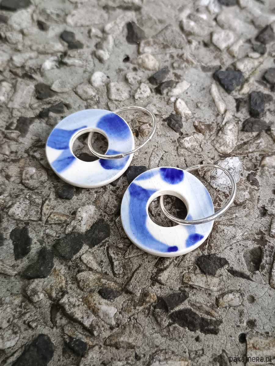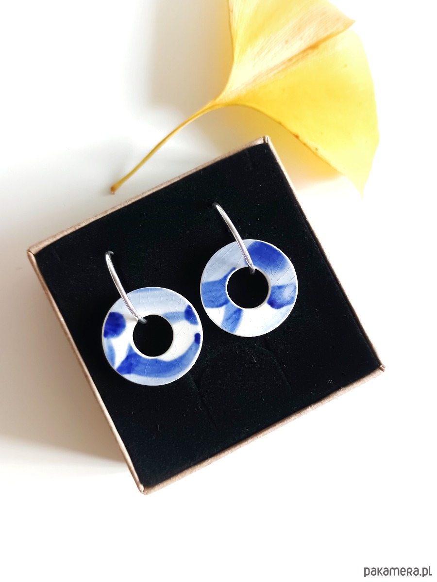 Historia fajansu włocławskiego sięga 1873 roku. Zakładów było kilka, zmieniali się właściciele i lokalizacje. Produkcja najbardziej rozwinęła się po II WŚ, kiedy w miejscowych zakładach powstawał nie tylko fajans, ale również porcelit i porcelana. Zróżnicowane było także wzornictwo - produkowano nie tylko naczynia, ale również elementy wyposażenia wnętrz (lampy, świeczniki, żyrandole). Mimo tej różnorodności, najbardziej rozpoznawalnym wyrobem z Włocławka jest talerz w ręcznie malowane kobaltowe kwiaty (z takich najchętniej korzystam :). I mimo, że najdłużej działająca fabryka zakończyła działalność w 1991 roku, dzięki lokalnym inicjatywom produkcja fajansu została wznowiona i trwa do dziś! Oto wiszące kolczyki, które wykonałam z fragmentów fajansu włocławskiego ręcznie malowanego w kobaltowe kwiaty. Kawałki stłuczki oszlifowałam w okrągłe kształty i połączyłam ze srebrnymi zapięciami. Ceramikę zeszlifowałam z grubości, dzięki czemu kolczyki nie są ciężkie. Brzegi i tył pokryłam lakierem, co sprawia, że nie brudzą się i nie chłoną wilgoci. Zapięcie, czyli koła o średnicy 19 mm wykonane są ze srebra próby 925 - wyrób jest antyalergiczny. Średnica elementów ceramicznych: 22 mm. Waga jednego kolczyka: 2,1 g. Unikat - każdy z moich wyrobów występuje w jednym egzemplarzu. Upcykling - nie reprodukuję wykorzystywanych wzorów, niczego nie domalowuję - wykorzystuję wyłącznie oryginalne naczynia i motywy, które się na nich znajdują. Tym samym, stłuczce z odzysku nadaję nowe życie.