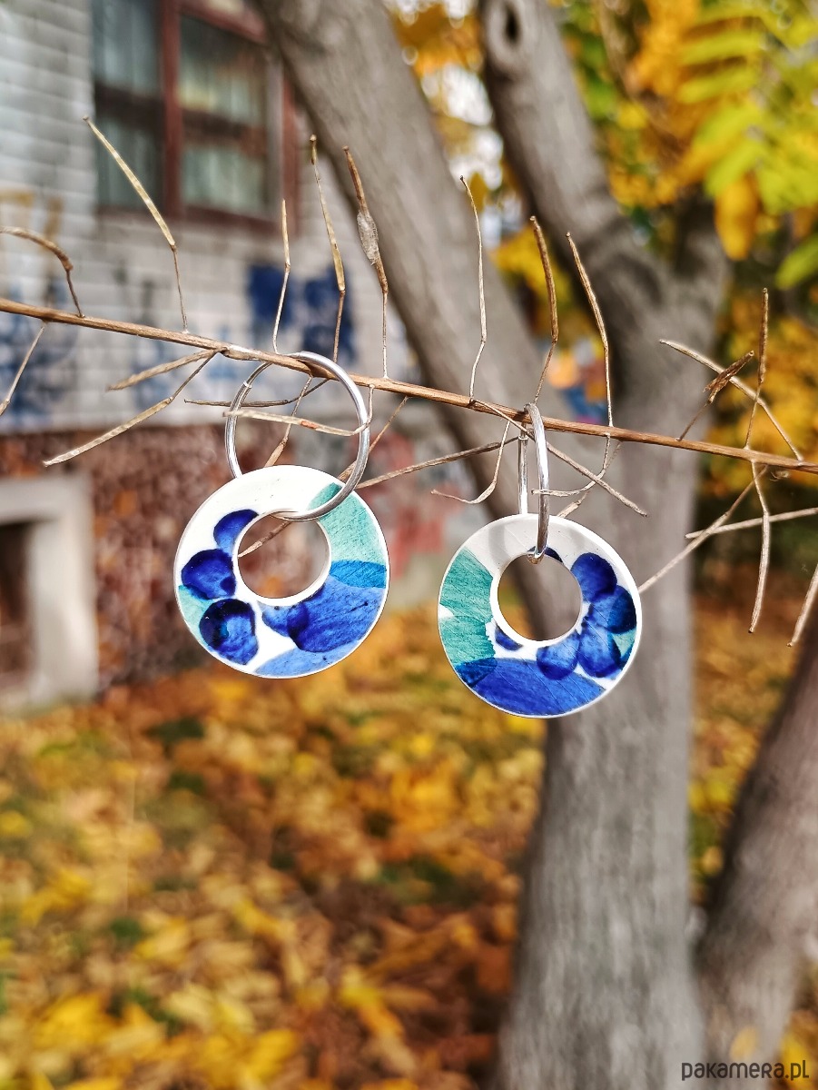 Historia fajansu włocławskiego sięga 1873 roku. Zakładów było kilka, zmieniali się właściciele i lokalizacje. Produkcja najbardziej rozwinęła się po II WŚ, kiedy w miejscowych zakładach powstawał nie tylko fajans, ale również porcelit i porcelana. Zróżnicowane było także wzornictwo - produkowano nie tylko naczynia, ale również elementy wyposażenia wnętrz (lampy, świeczniki, żyrandole). Mimo tej różnorodności, najbardziej rozpoznawalnym wyrobem z Włocławka jest talerz w ręcznie malowane kobaltowe kwiaty (z takich najchętniej korzystam :). I mimo, że najdłużej działająca fabryka zakończyła działalność w 1991 roku, dzięki lokalnym inicjatywom produkcja fajansu została wznowiona i trwa do dziś! Oto wiszące kolczyki, które wykonałam z fragmentów fajansu włocławskiego ręcznie malowanego w kolorowe kwiaty. Kawałki stłuczki oszlifowałam w okrągłe kształty i połączyłam ze srebrnymi zapięciami. Ceramikę zeszlifowałam z grubości, dzięki czemu kolczyki nie są ciężkie. Brzegi i tył pokryłam lakierem, co sprawia, że nie brudzą się i nie chłoną wilgoci. Zapięcie, czyli koła o średnicy 19 mm wykonane są ze srebra próby 925 - wyrób jest antyalergiczny. Średnica elementów ceramicznych: 25 mm. Waga jednego kolczyka: 2,2 g. Unikat - każdy z moich wyrobów występuje w jednym egzemplarzu. Upcykling - nie reprodukuję wykorzystywanych wzorów, niczego nie domalowuję - wykorzystuję wyłącznie oryginalne naczynia i motywy, które się na nich znajdują. Tym samym, stłuczce z odzysku nadaję nowe życie.