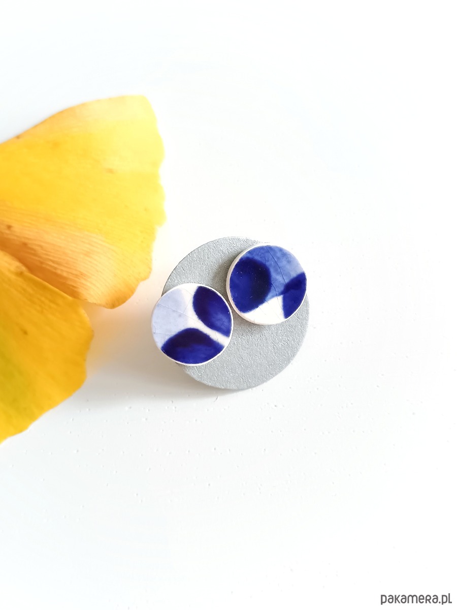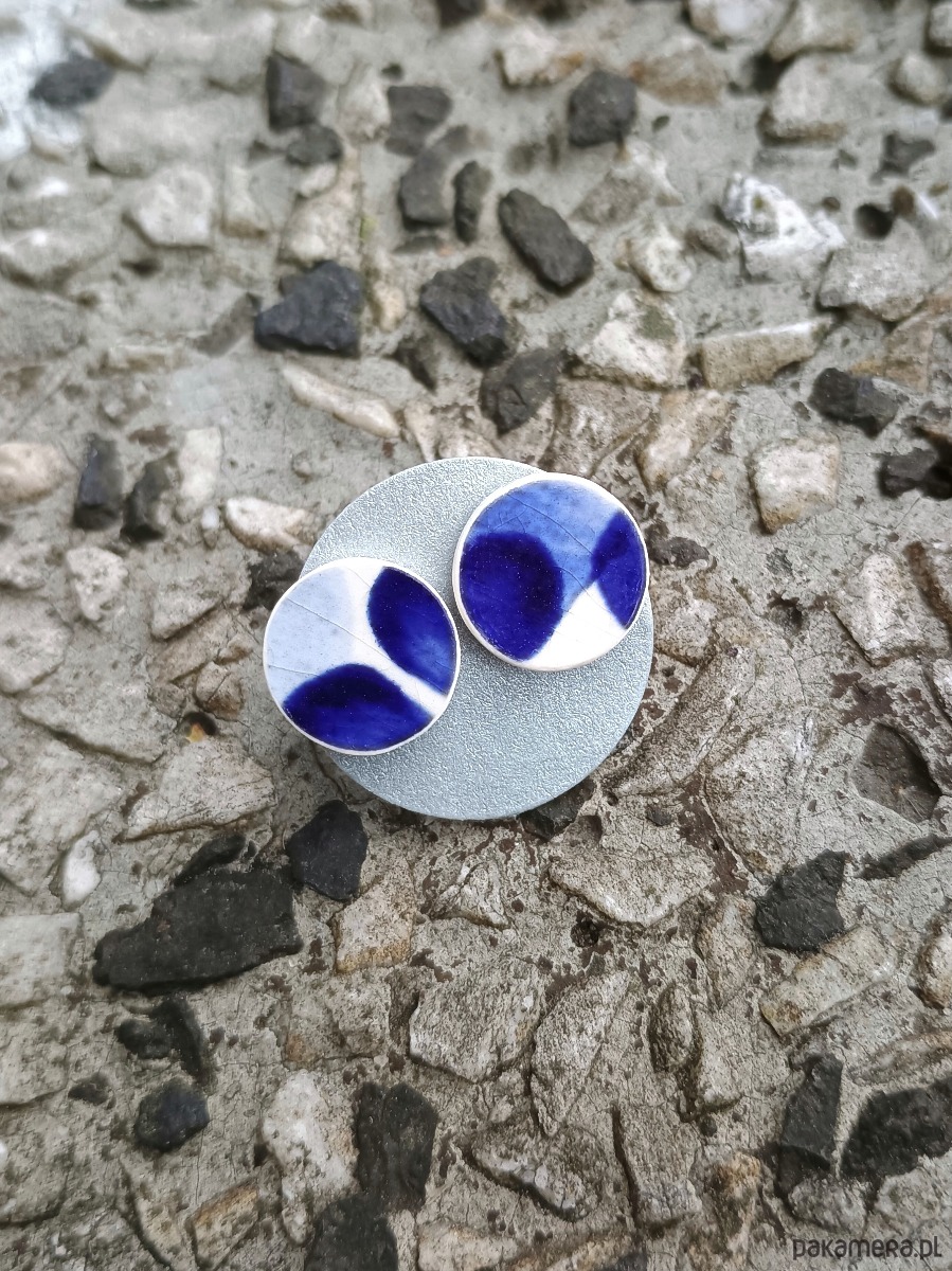 Historia fajansu włocławskiego sięga 1873 roku. Zakładów było kilka, zmieniali się właściciele i lokalizacje. Produkcja najbardziej rozwinęła się po II WŚ, kiedy w miejscowych zakładach powstawał nie tylko fajans, ale również porcelit i porcelana. Zróżnicowane było także wzornictwo - produkowano nie tylko naczynia, ale również elementy wyposażenia wnętrz (lampy, świeczniki, żyrandole). Mimo tej różnorodności, najbardziej rozpoznawalnym wyrobem z Włocławka jest talerz w ręcznie malowane kobaltowe kwiaty (z takich najchętniej korzystam :). I mimo, że najdłużej działająca fabryka zakończyła działalność w 1991 roku, dzięki lokalnym inicjatywom produkcja fajansu została wznowiona i trwa do dziś! Oto nieduże okrągłe kolczyki, które wykonałam z fragmentów fajansu włocławskiego ręcznie malowanego w kobaltowe wzory. Kawałki stłuczki oszlifowałam i połączyłam ze srebrnymi sztyftami. Ceramikę zeszlifowałam również z grubości - jest cieńsza niż pierwotnie, dzięki czemu kolczyki nie są masywne. Brzegi i tył pokryłam lakierem, co sprawia, że nie brudzą się i nie chłoną wilgoci. Sztyfty oraz baranki (zapięcia) wykonane są ze srebra próby 925 - wyrób jest antyalergiczny. Średnica elementów ceramicznych: 12 mm. Unikat - każdy z moich wyrobów występuje w jednym egzemplarzu. Upcykling - nie reprodukuję wykorzystywanych wzorów, niczego nie domalowuję - wykorzystuję wyłącznie oryginalne naczynia i motywy, które się na nich znajdują. Tym samym, stłuczce z odzysku nadaję nowe życie.
