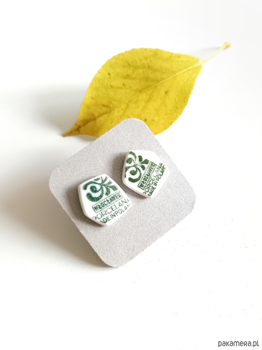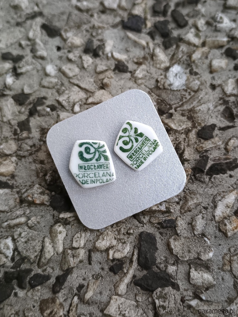 Historia fajansu włocławskiego sięga 1873 roku. Zakładów było kilka, zmieniali się właściciele i lokalizacje. Produkcja najbardziej rozwinęła się po II WŚ, kiedy w miejscowych zakładach powstawał nie tylko fajans, ale również porcelit i porcelana. Zróżnicowane było także wzornictwo - produkowano nie tylko naczynia, ale również elementy wyposażenia wnętrz (lampy, świeczniki, żyrandole). Mimo tej różnorodności, najbardziej rozpoznawalnym wyrobem z Włocławka jest talerz w ręcznie malowane kobaltowe kwiaty (z takich najchętniej korzystam :). I mimo, że najdłużej działająca fabryka zakończyła działalność w 1991 roku, dzięki lokalnym inicjatywom produkcja fajansu została wznowiona i trwa do dziś! Oto duże kolczyki, które wykonałam z fragmentów stłuczonych talerzy z Włocłąwka z widocznymi sygnaturami. Kawałki stłuczki oszlifowałam i połączyłam ze srebrnymi sztyftami. Ceramikę zeszlifowałam również z grubości - jest cieńsza niż pierwotnie, dzięki czemu kolczyki nie są masywne. Brzegi i tył pokryłam lakierem, co sprawia, że nie brudzą się i nie chłoną wilgoci. Sztyfty oraz baranki (zapięcia) wykonane są ze srebra próby 925 - wyrób jest antyalergiczny. Wymiary elementów ceramicznych: 13 x 14 mm. Unikat - każdy z moich wyrobów występuje w jednym egzemplarzu. Upcykling - nie reprodukuję wykorzystywanych wzorów, niczego nie domalowuję - wykorzystuję wyłącznie oryginalne naczynia i motywy, które się na nich znajdują. Tym samym, stłuczce z odzysku nadaję nowe życie.