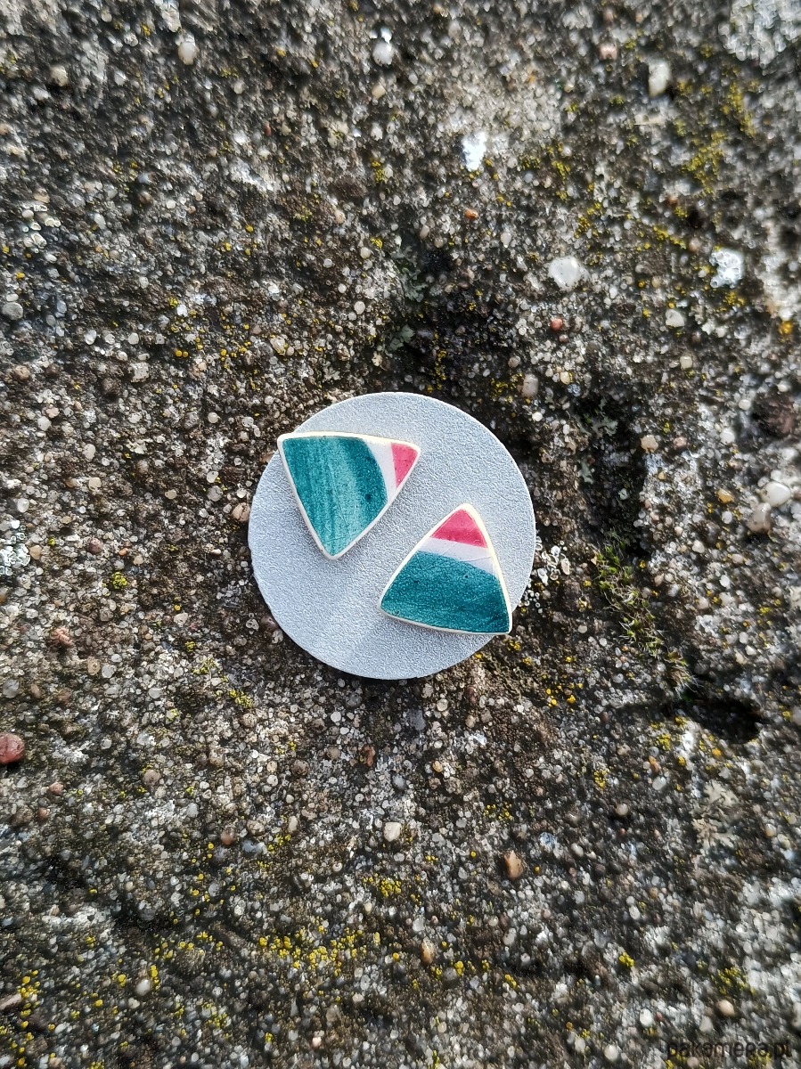 Historia fajansu włocławskiego sięga 1873 roku. Zakładów było kilka, zmieniali się właściciele i lokalizacje. Produkcja najbardziej rozwinęła się po II WŚ, kiedy w miejscowych zakładach powstawał nie tylko fajans, ale również porcelit i porcelana. Zróżnicowane było także wzornictwo - produkowano nie tylko naczynia, ale również elementy wyposażenia wnętrz (lampy, świeczniki, żyrandole). Mimo tej różnorodności, najbardziej rozpoznawalnym wyrobem z Włocławka jest talerz w ręcznie malowane kobaltowe kwiaty (z takich najchętniej korzystam :). I mimo, że najdłużej działająca fabryka zakończyła działalność w 1991 roku, dzięki lokalnym inicjatywom produkcja fajansu została wznowiona i trwa do dziś! Oto nieduże trójkątne kolczyki, które wykonałam z fragmentów fajansu włocławskiego ręcznie malowanego w kolorowe wzory. Kawałki stłuczki oszlifowałam i połączyłam ze srebrnymi sztyftami. Ceramikę zeszlifowałam również z grubości - jest cieńsza niż pierwotnie, dzięki czemu kolczyki nie są masywne. Brzegi i tył pokryłam lakierem, co sprawia, że nie brudzą się i nie chłoną wilgoci. Sztyfty oraz baranki (zapięcia) wykonane są ze srebra próby 925 - wyrób jest antyalergiczny. Wymiary elementów ceramicznych: 10 x 10 mm. Unikat - każdy z moich wyrobów występuje w jednym egzemplarzu. Upcykling - nie reprodukuję wykorzystywanych wzorów, niczego nie domalowuję - wykorzystuję wyłącznie oryginalne naczynia i motywy, które się na nich znajdują. Tym samym, stłuczce z odzysku nadaję nowe życie.