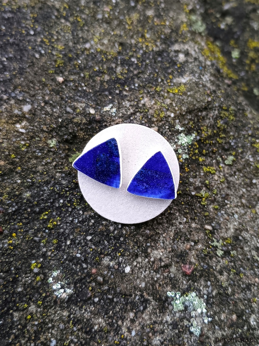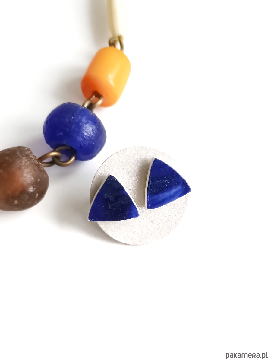 Historia fajansu włocławskiego sięga 1873 roku. Zakładów było kilka, zmieniali się właściciele i lokalizacje. Produkcja najbardziej rozwinęła się po II WŚ, kiedy w miejscowych zakładach powstawał nie tylko fajans, ale również porcelit i porcelana. Zróżnicowane było także wzornictwo - produkowano nie tylko naczynia, ale również elementy wyposażenia wnętrz (lampy, świeczniki, żyrandole). Mimo tej różnorodności, najbardziej rozpoznawalnym wyrobem z Włocławka jest talerz w ręcznie malowane kobaltowe kwiaty (z takich najchętniej korzystam :). I mimo, że najdłużej działająca fabryka zakończyła działalność w 1991 roku, dzięki lokalnym inicjatywom produkcja fajansu została wznowiona i trwa do dziś! Oto nieduże trójkątne kolczyki, które wykonałam z fragmentów fajansu włocławskiego ręcznie malowanego w kobaltowe wzory. Kawałki stłuczki oszlifowałam i połączyłam ze srebrnymi sztyftami. Ceramikę zeszlifowałam również z grubości - jest cieńsza niż pierwotnie, dzięki czemu kolczyki nie są masywne. Brzegi i tył pokryłam lakierem, co sprawia, że nie brudzą się i nie chłoną wilgoci. Sztyfty oraz baranki (zapięcia) wykonane są ze srebra próby 925 - wyrób jest antyalergiczny. Wymiary elementów ceramicznych: 11 x 11 mm. Unikat - każdy z moich wyrobów występuje w jednym egzemplarzu. Upcykling - nie reprodukuję wykorzystywanych wzorów, niczego nie domalowuję - wykorzystuję wyłącznie oryginalne naczynia i motywy, które się na nich znajdują. Tym samym, stłuczce z odzysku nadaję nowe życie.