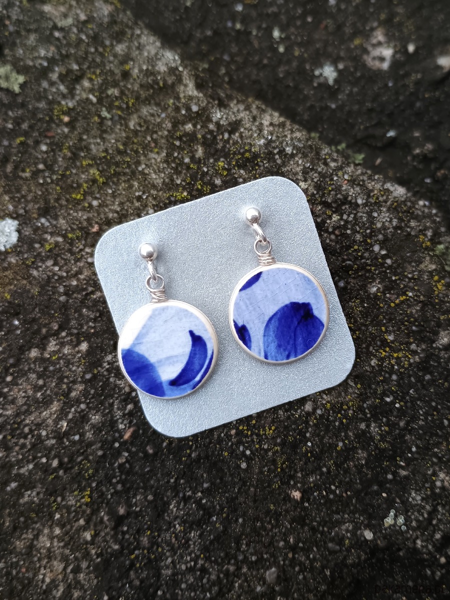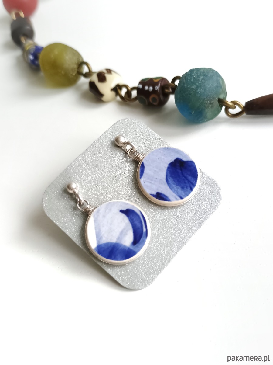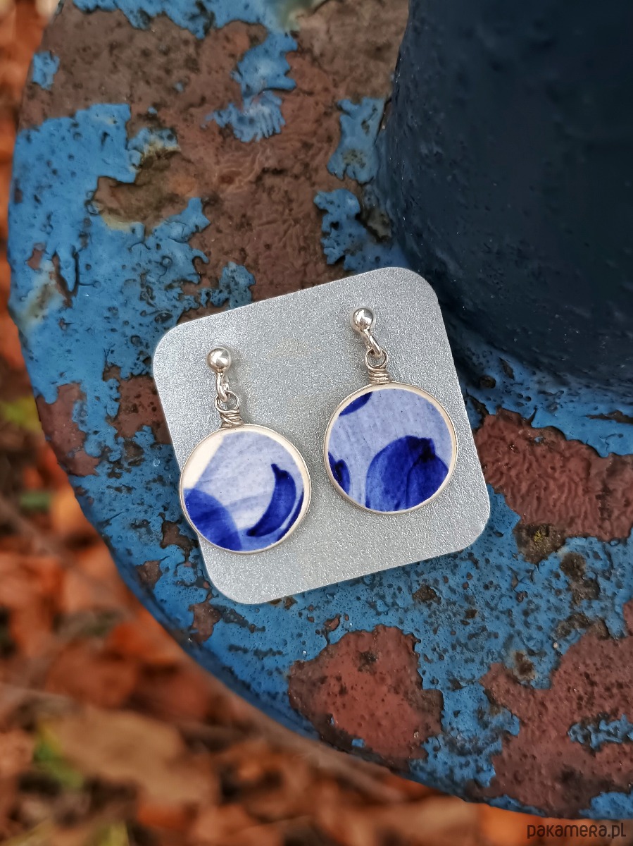 Historia fajansu włocławskiego sięga 1873 roku. Zakładów było kilka, zmieniali się właściciele i lokalizacje. Produkcja najbardziej rozwinęła się po II WŚ, kiedy w miejscowych zakładach powstawał nie tylko fajans, ale również porcelit i porcelana. Zróżnicowane było także wzornictwo - produkowano nie tylko naczynia, ale również elementy wyposażenia wnętrz (lampy, świeczniki, żyrandole). Mimo tej różnorodności, najbardziej rozpoznawalnym wyrobem z Włocławka jest talerz w ręcznie malowane kobaltowe kwiaty (z takich najchętniej korzystam :). I mimo, że najdłużej działająca fabryka zakończyła działalność w 1991 r., dzięki lokalnym inicjatywom produkcja fajansu została wznowiona i trwa do dziś! Oto kolczyki, które wykonałam z fragmentów fajansu włocławskiego ręcznie malowanego w kobaltowe wzory. Kawałki stłuczki oszlifowałam, oprawiłam w drucik i połączyłam ze srebrnymi sztyftami. Ceramikę zeszlifowałam również z grubości - jest cieńsza niż pierwotnie, dzięki czemu kolczyki nie są masywne. Brzegi i tył pokryłam lakierem, co sprawia, że nie brudzą się i nie chłoną wilgoci. Oprawa oraz sztyfty wykonane są ze srebra próby 925 - wyrób jest antyalergiczny. Średnica el. ceramicznego: 15 mm. Waga jednego kolczyka: 1,1 g. Unikat - każdy z moich wyrobów występuje w jednym egzemplarzu. Upcykling - nie reprodukuję wykorzystywanych wzorów, niczego nie domalowuję - wykorzystuję wyłącznie oryginalne naczynia i motywy, które się na nich znajdują. Tym samym, stłuczce z odzysku nadaję nowe życie.