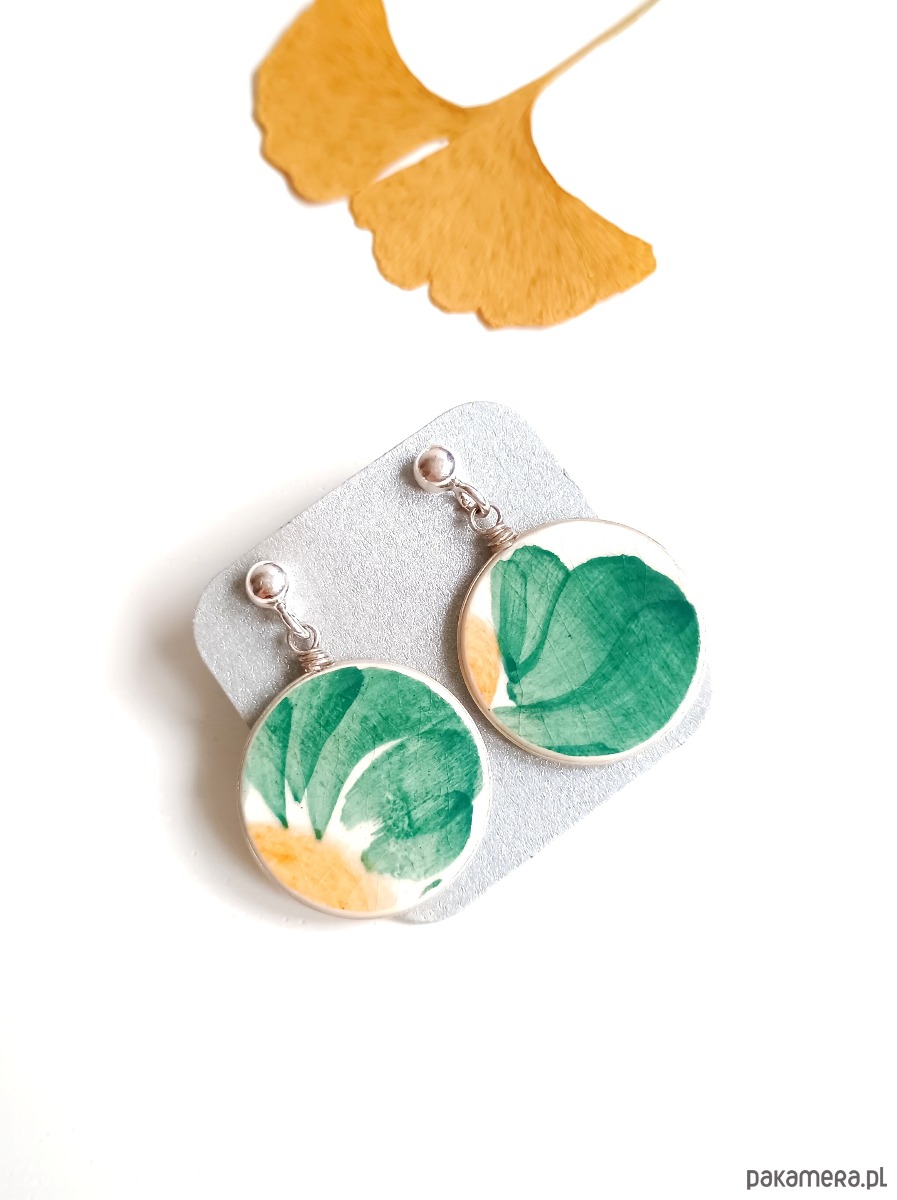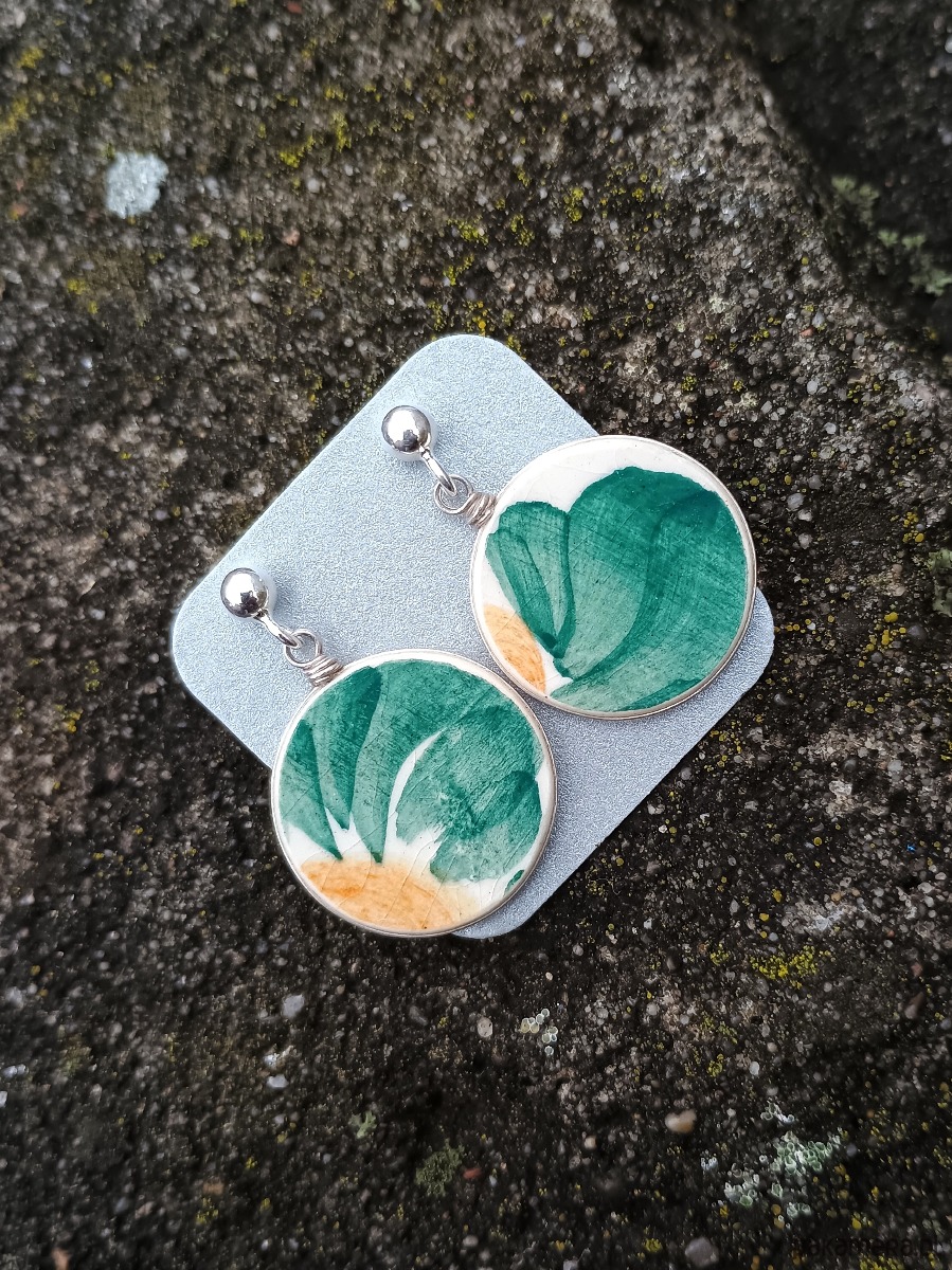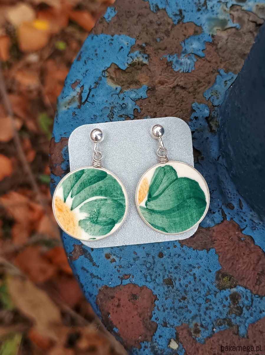 Historia fajansu włocławskiego sięga 1873 roku. Zakładów było kilka, zmieniali się właściciele i lokalizacje. Produkcja najbardziej rozwinęła się po II WŚ, kiedy w miejscowych zakładach powstawał nie tylko fajans, ale również porcelit i porcelana. Zróżnicowane było także wzornictwo - produkowano nie tylko naczynia, ale również elementy wyposażenia wnętrz (lampy, świeczniki, żyrandole). Mimo tej różnorodności, najbardziej rozpoznawalnym wyrobem z Włocławka jest talerz w ręcznie malowane kobaltowe kwiaty (z takich najchętniej korzystam :). I mimo, że najdłużej działająca fabryka zakończyła działalność w 1991 r., dzięki lokalnym inicjatywom produkcja fajansu została wznowiona i trwa do dziś! Oto kolczyki, które wykonałam z fragmentów fajansu włocławskiego ręcznie malowanego w kolorowe wzory. Kawałki stłuczki oszlifowałam, oprawiłam w drucik i połączyłam ze srebrnymi sztyftami. Ceramikę zeszlifowałam również z grubości - jest cieńsza niż pierwotnie, dzięki czemu kolczyki nie są masywne. Brzegi i tył pokryłam lakierem, co sprawia, że nie brudzą się i nie chłoną wilgoci. Oprawa oraz sztyfty wykonane są ze srebra próby 925 - wyrób jest antyalergiczny. Średnica el. ceramicznego: 20 mm. Waga jednego kolczyka: 1,7 g. Unikat - każdy z moich wyrobów występuje w jednym egzemplarzu. Upcykling - nie reprodukuję wykorzystywanych wzorów, niczego nie domalowuję - wykorzystuję wyłącznie oryginalne naczynia i motywy, które się na nich znajdują. Tym samym, stłuczce z odzysku nadaję nowe życie.