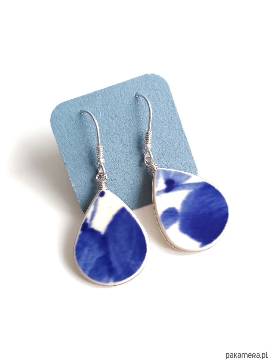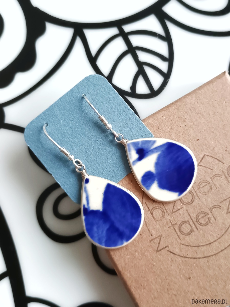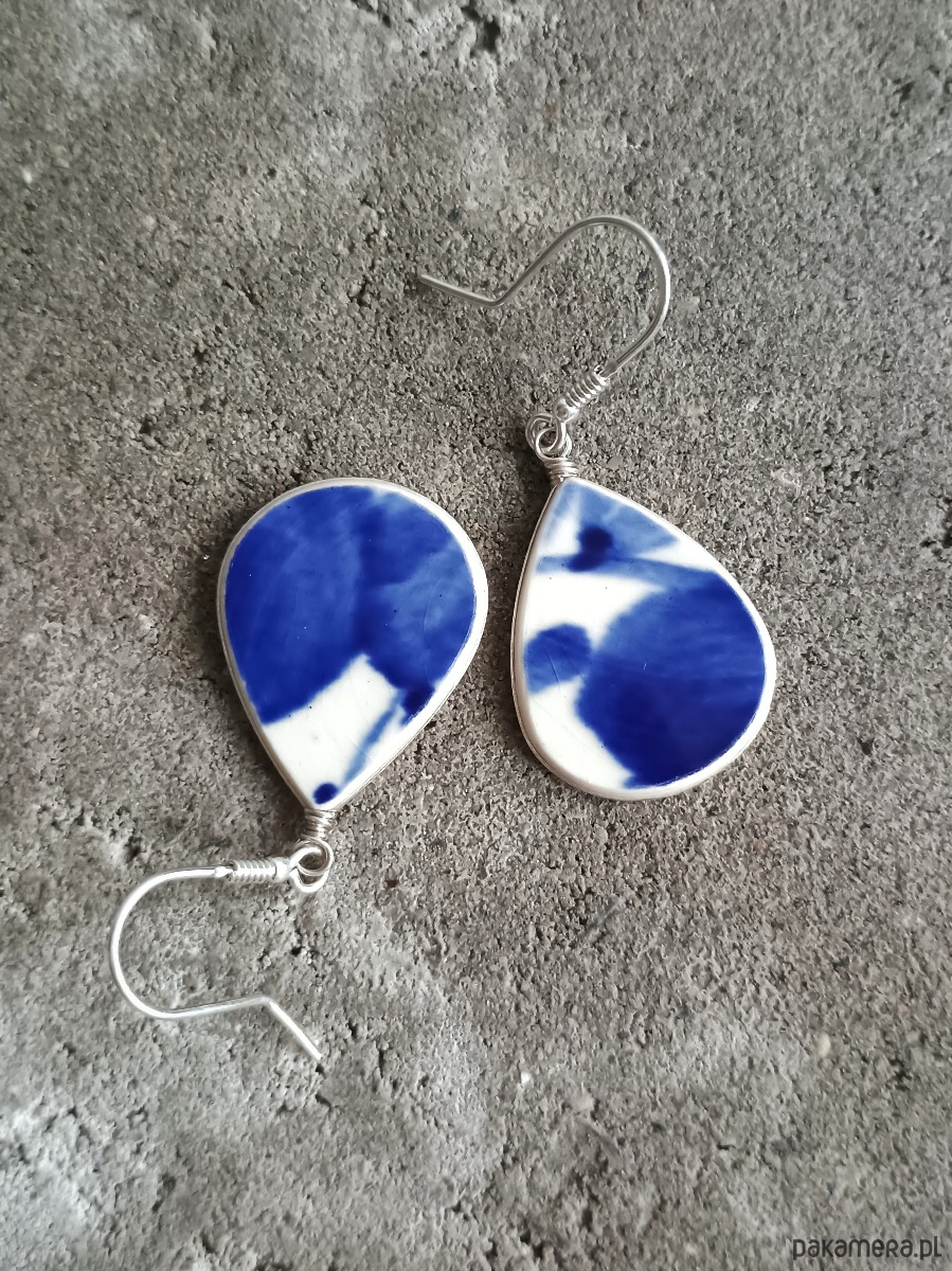 Historia fajansu włocławskiego sięga 1873 roku. Zakładów było kilka, zmieniali się właściciele i lokalizacje. Produkcja najbardziej rozwinęła się po II WŚ, kiedy w miejscowych zakładach powstawał nie tylko fajans, ale również porcelit i porcelana. Zróżnicowane było także wzornictwo - produkowano nie tylko naczynia, ale również elementy wyposażenia wnętrz (lampy, świeczniki, żyrandole). Mimo tej różnorodności, najbardziej rozpoznawalnym wyrobem z Włocławka jest talerz w ręcznie malowane kobaltowe kwiaty (z takich najchętniej korzystam :). I mimo, że najdłużej działająca fabryka zakończyła działalność w 1991 roku, dzięki lokalnym inicjatywom produkcja fajansu została wznowiona i trwa do dziś! Oto wiszące kolczyki, które wykonałam z fragmentów fajansu włocławskiego ręcznie malowanego w kobaltowe kwiaty. Kawałki stłuczki oszlifowałam, oprawiłam w drucik i połączyłam ze srebrnymi biglami. Ceramikę zeszlifowałam również z grubości - jest cieńsza niż pierwotnie, dzięki czemu kolczyki nie są masywne. Brzegi i tył pokryłam lakierem, co sprawia, że nie brudzą się i nie chłoną wilgoci. Oprawa oraz bigle wykonane są ze srebra próby 925 - wyrób jest antyalergiczny. Wymiary elementów: 19 x 25 mm. Waga jednego kolczyka: 2 g. Unikat - każdy z moich wyrobów występuje w jednym egzemplarzu. Upcykling - nie reprodukuję wykorzystywanych wzorów, niczego nie domalowuję - wykorzystuję wyłącznie oryginalne naczynia i motywy, które się na nich znajdują. Tym samym, stłuczce z odzysku nadaję nowe życie.