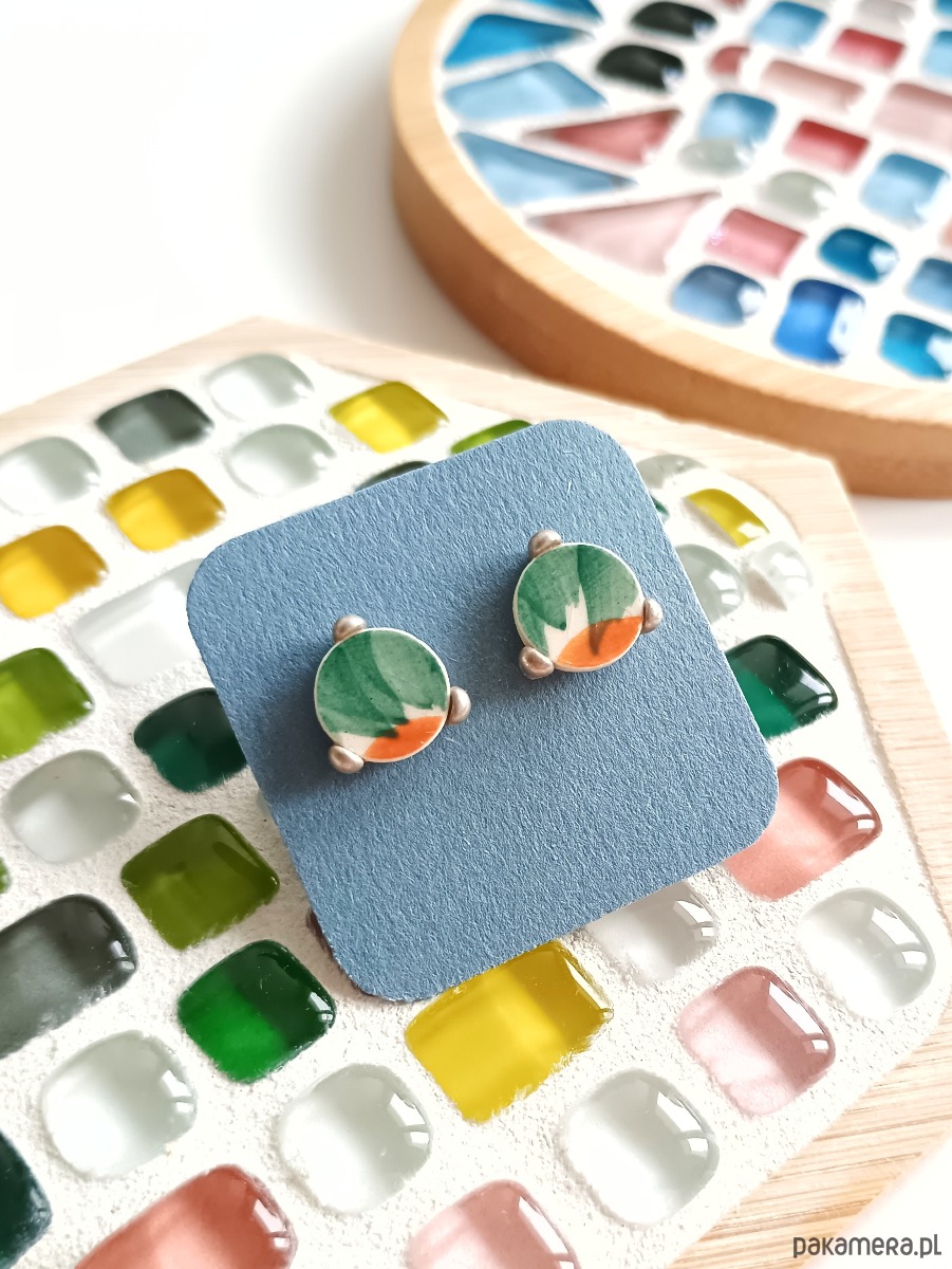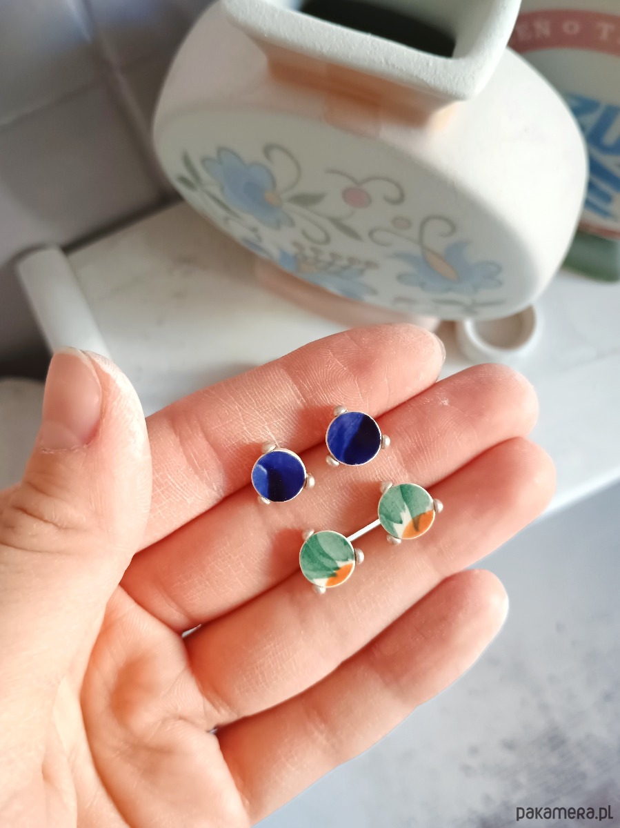Historia fajansu włocławskiego sięga 1873 roku. Zakładów było kilka, zmieniali się właściciele i lokalizacje. Produkcja najbardziej rozwinęła się po II WŚ, kiedy w miejscowych zakładach powstawał nie tylko fajans, ale również porcelit i porcelana. Zróżnicowane było także wzornictwo - produkowano nie tylko naczynia, ale również elementy wyposażenia wnętrz (lampy, świeczniki, żyrandole). Mimo tej różnorodności, najbardziej rozpoznawalnym wyrobem z Włocławka jest talerz w ręcznie malowane kobaltowe kwiaty (z takich najchętniej korzystam :). I mimo, że najdłużej działająca fabryka zakończyła działalność w 1991 roku, dzięki lokalnym inicjatywom produkcja fajansu została wznowiona i trwa do dziś! Oto nieduże kolczyki, które wykonałam z fragmentów fajansu włocławskiego ręcznie malowanego w kolorowe wzory. Kawałki stłuczki oszlifowałam i połączyłam ze srebrnymi sztyftami z dekoracyjną oprawą. Ceramikę zeszlifowałam również z grubości - jest cieńsza niż pierwotnie, dzięki czemu kolczyki nie są masywne. Brzegi i tył pokryłam lakierem, co sprawia, że nie brudzą się i nie chłoną wilgoci. Sztyfty oraz baranki (zapięcia) wykonane są ze srebra próby 925 - wyrób jest antyalergiczny. Średnica elementów ceramicznych: 9 mm. Unikat - każdy z moich wyrobów występuje w jednym egzemplarzu. Upcykling - nie reprodukuję wykorzystywanych wzorów, niczego nie domalowuję - wykorzystuję wyłącznie oryginalne naczynia i motywy, które się na nich znajdują. Tym samym, stłuczce z odzysku nadaję nowe życie.