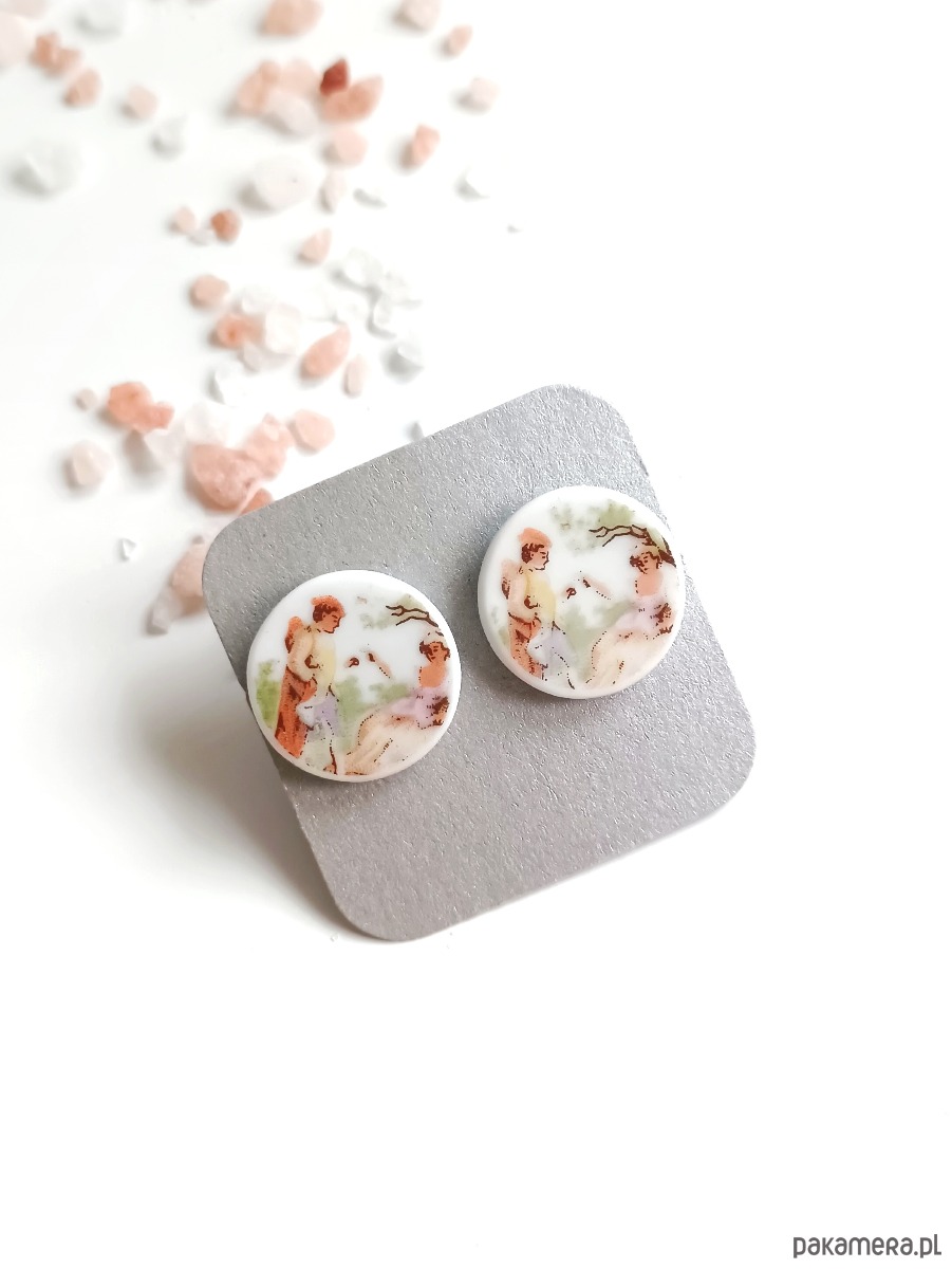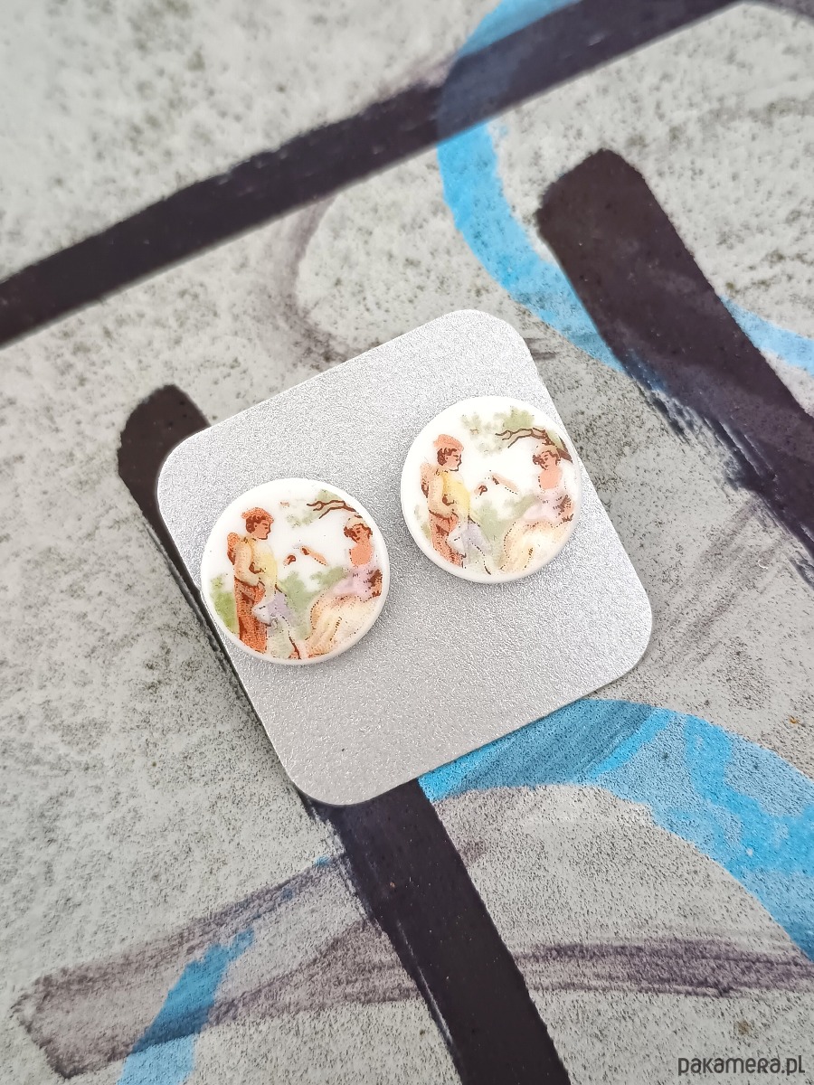 Okrągłe kolczyki, które wykonałam z fragmentów stłuczonego talerza dekorowanego w scenki z postaciami. Kawałki stłuczki oszlifowałam i połączyłam ze srebrnymi sztyftami. Ceramikę zeszlifowałam również z grubości - jest cieńsza niż pierwotnie, dzięki czemu kolczyki nie są masywne. Brzegi pokryłam lakierem, co sprawia, że nie brudzą się i nie chłoną wilgoci. Sztyfty oraz baranki (zapięcia) wykonane są ze srebra próby 925 - wyrób jest antyalergiczny. Średnica elementów ceramicznych: 15 mm. Unikat - każdy z moich wyrobów występuje w jednym egzemplarzu. Upcykling - nie reprodukuję wykorzystywanych wzorów, niczego nie domalowuję - wykorzystuję wyłącznie oryginalne naczynia i motywy, które się na nich znajdują. Tym samym, stłuczce z odzysku nadaję nowe życie.
