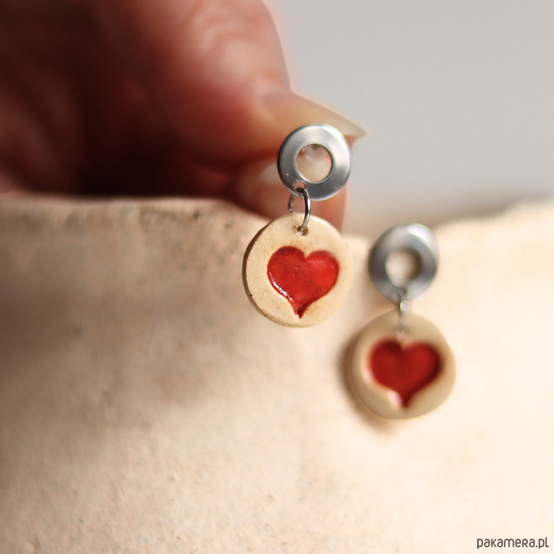 Kolczyki z ceramiczną zawieszką z czerwonym (makowym) sercem.