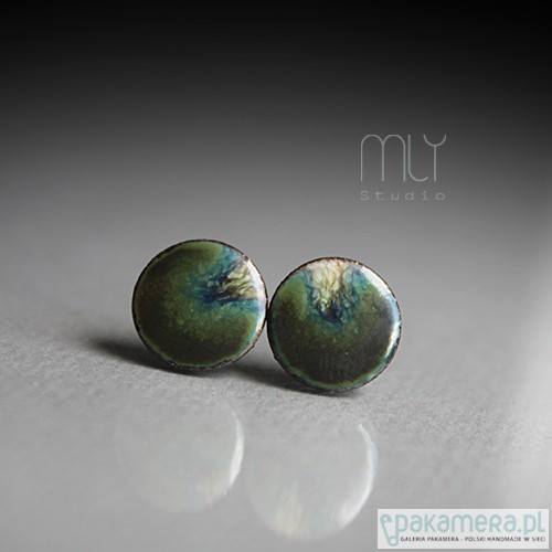 Ceramiczne okrągłe kolczyki w formie sztyftów, ręcznie wykonane z delikatnej czekoladowobrązowej gliny kamionkowej, jednostronnie szkliwione mieszanką zielonych szkliw z efektem plamek, na antyalergicznych sztyftach w kolorze srebrnym. Średnica ok. 9mm. Polecam